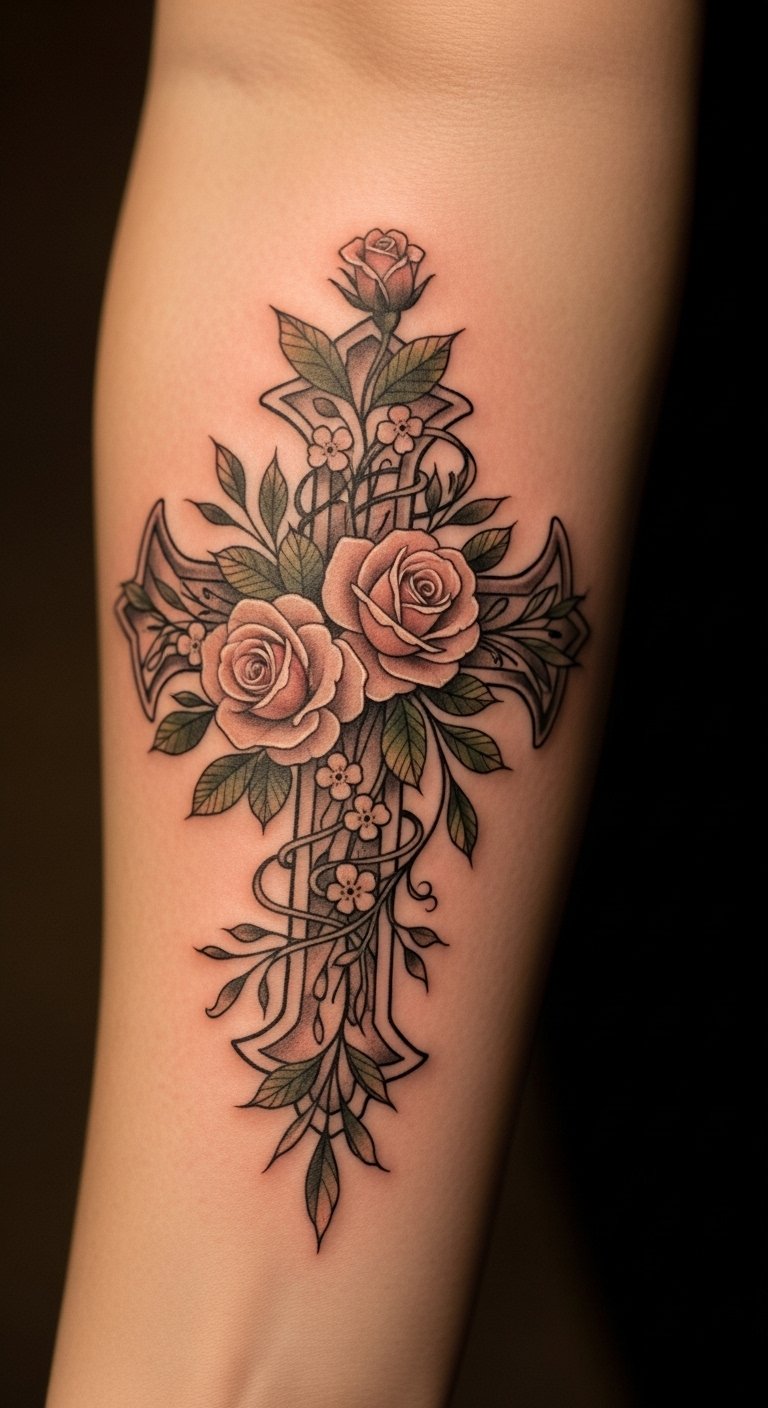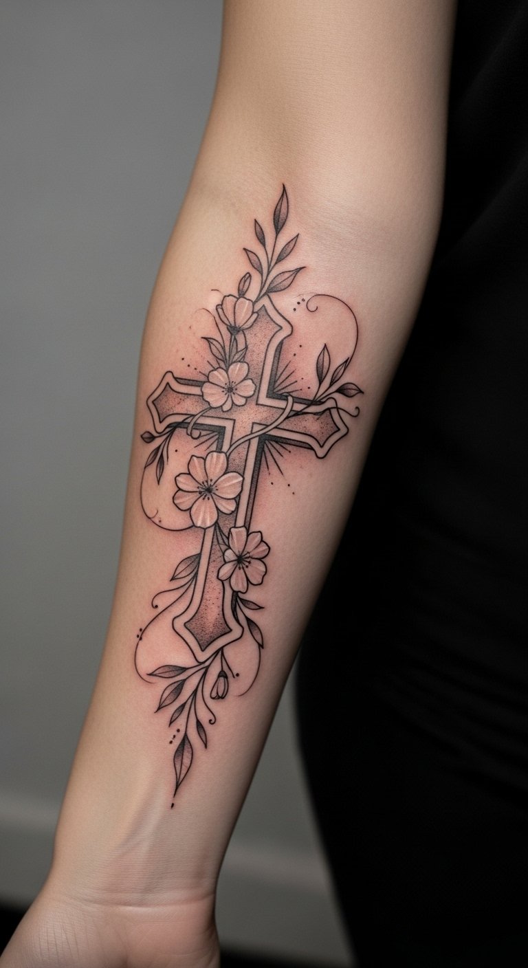 The cross represents faith and inner strength, while the vines and flowers signify growth and the ability to flourish even in adversity.
