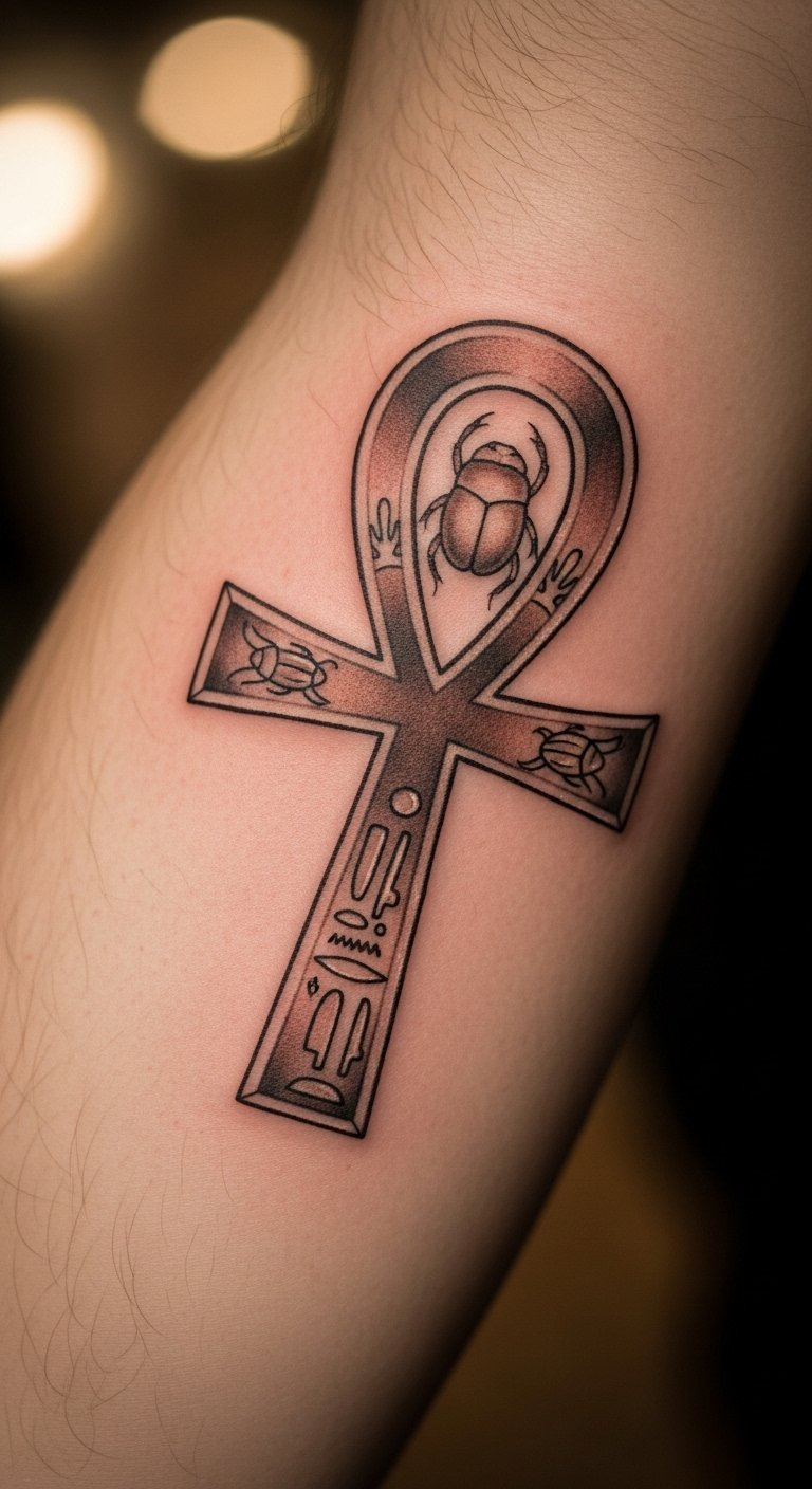 The ankh tattoo on the forearm symbolizes life and immortality, serving as a profound reminder of existence’s richness.