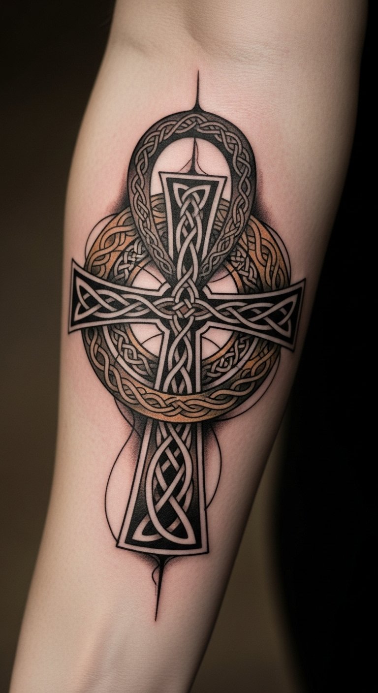 The tattoo symbolizes the interconnectedness of diverse spiritual beliefs, merging the ancient Egyptian Ankh, representing life, with the Celtic cross, which embodies faith and eternity.
