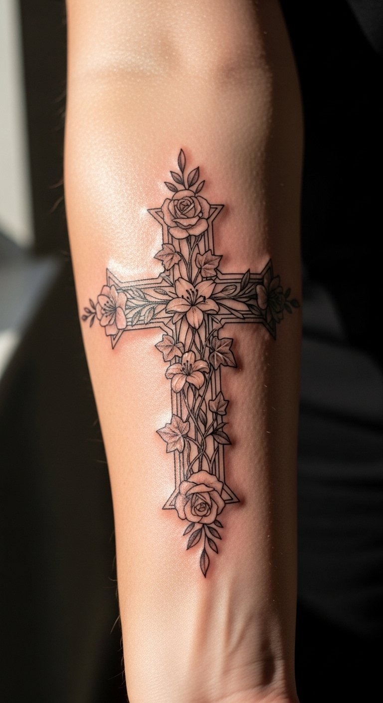 This tattoo symbolizes a journey through sacrifice and resilience, reflecting the wearer’s personal experiences and faith. Positioned on the forearm, it serves as a visible reminder of strength and the stories that shape one’s identity. The floral elements signify growth and renewal, while the geometric shapes represent stability and balance in life. This placement ensures the tattoo is a constant source of inspiration, encouraging deep reflection on the meanings behind each intricate detail.