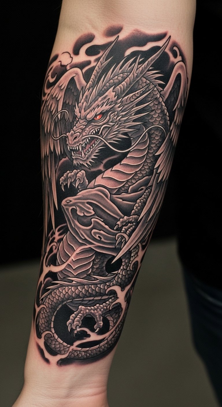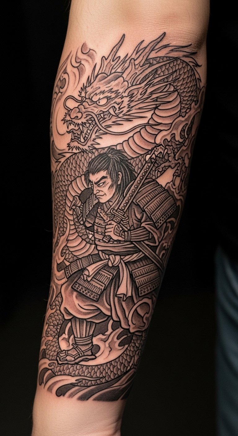 Placing this design on the forearm allows for a constant reminder of bravery and resilience, visible in daily life. The fierce dragon symbolizes strength and protection, while the poised samurai represents honor and discipline.