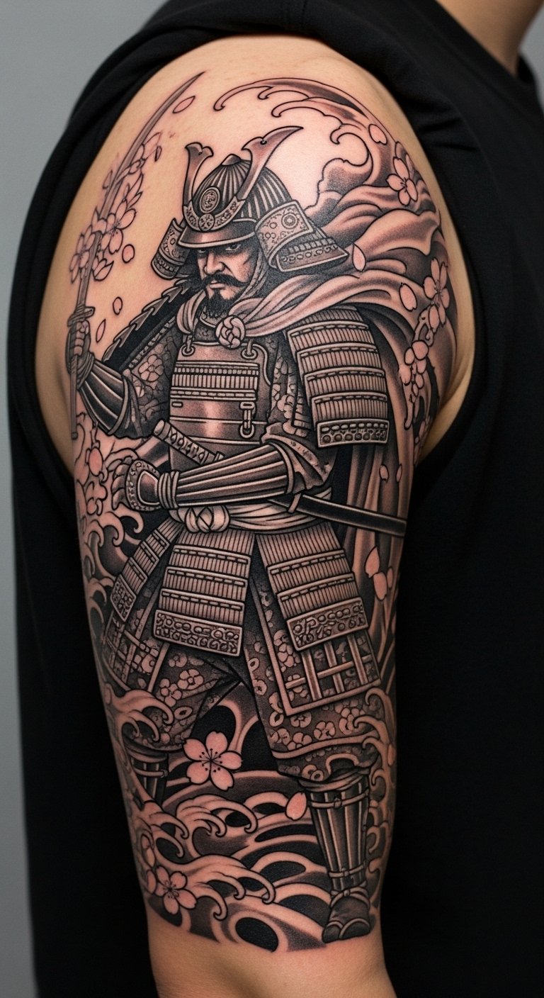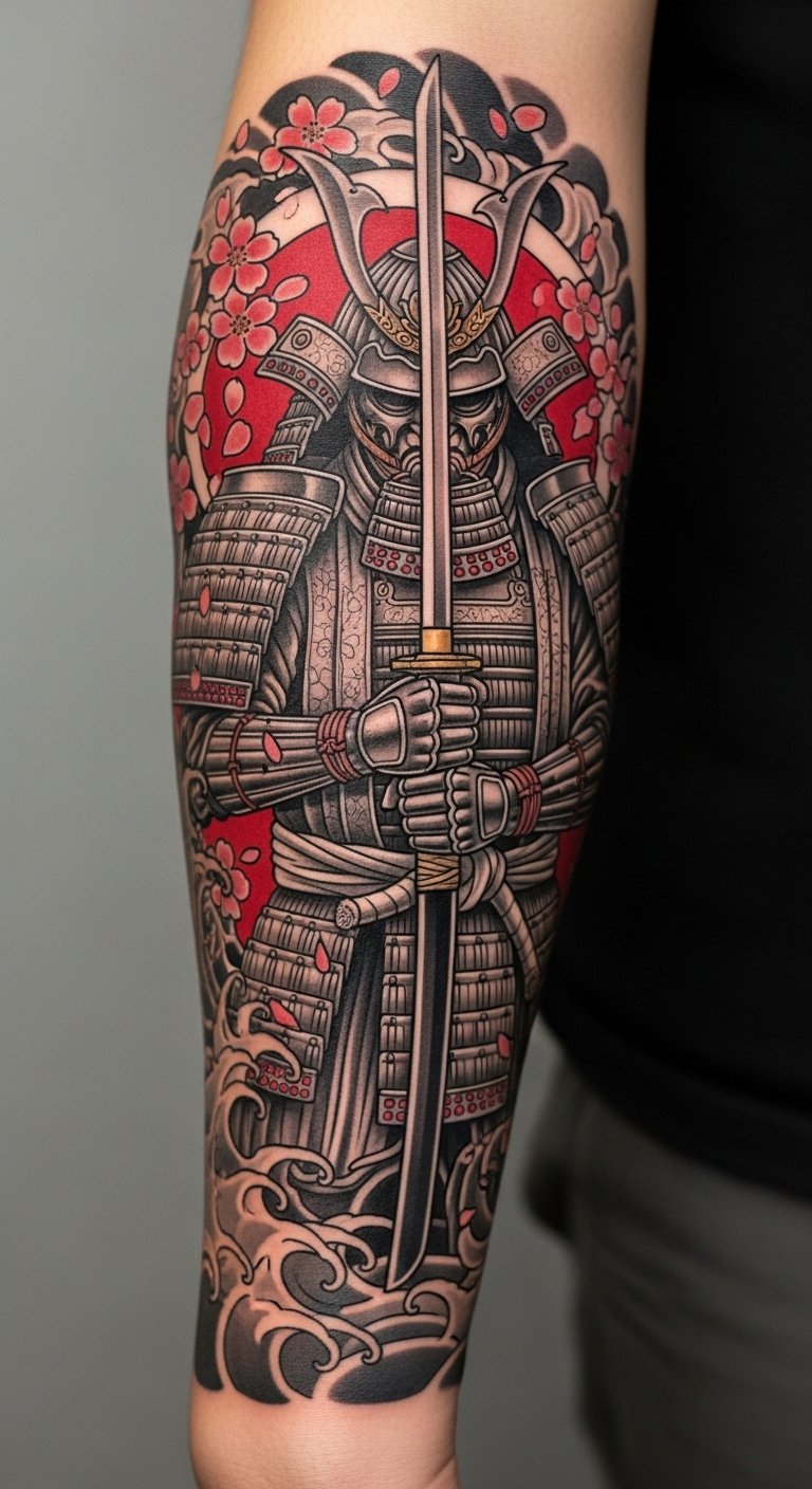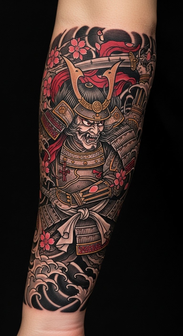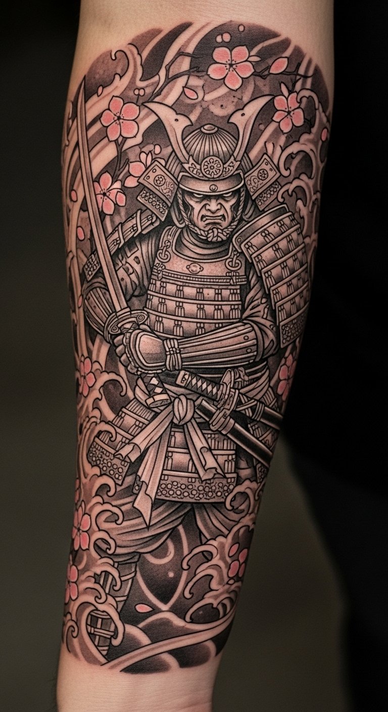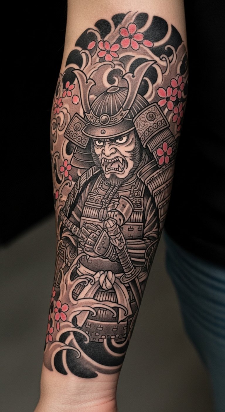 This tattoo symbolizes the strength and honor of the samurai, embodying resilience and the warrior’s code.