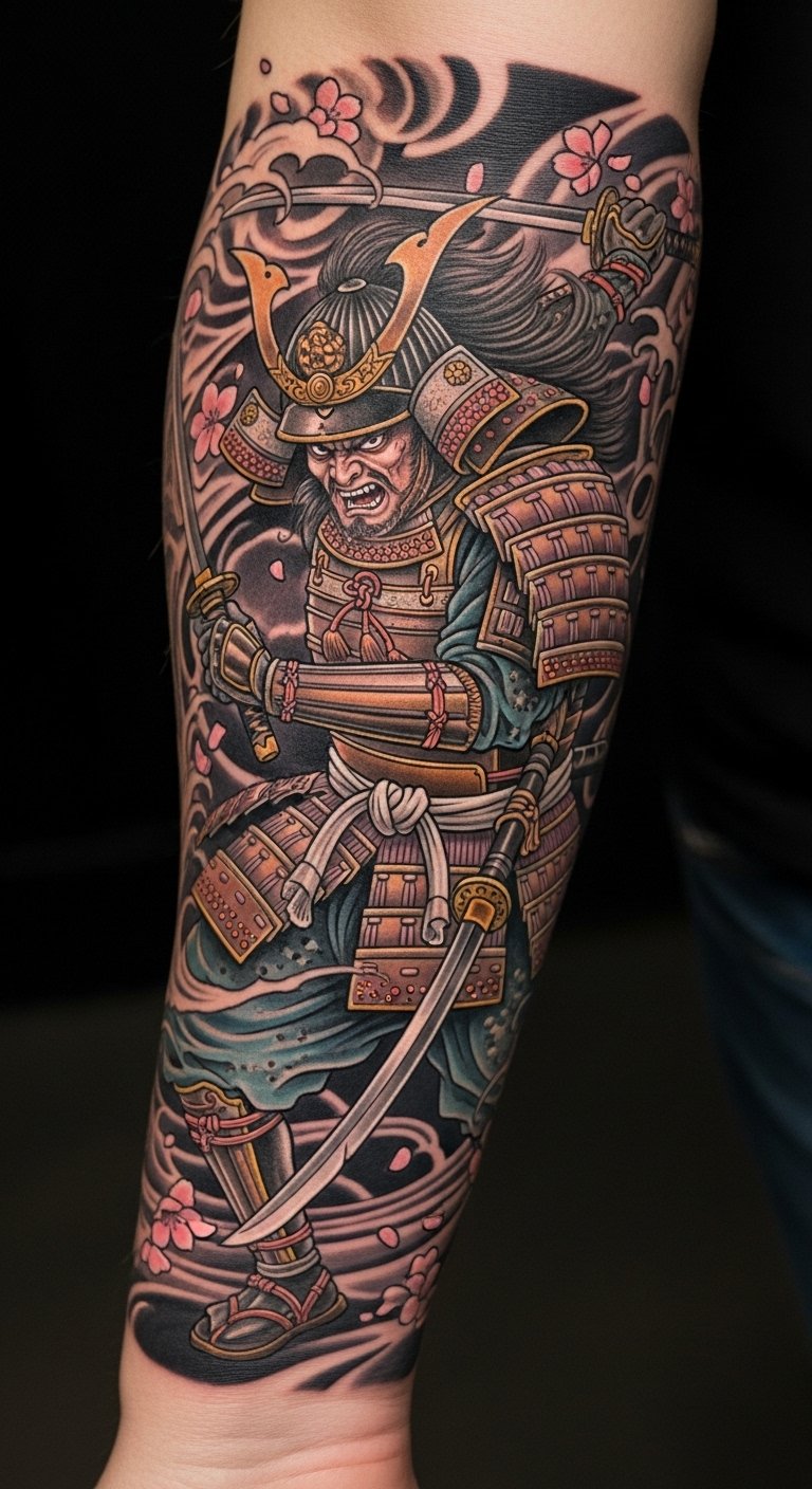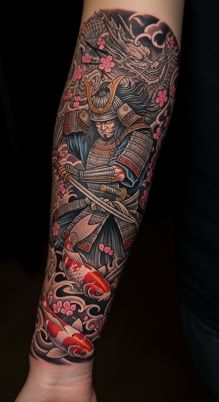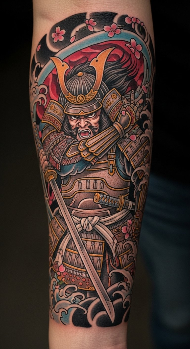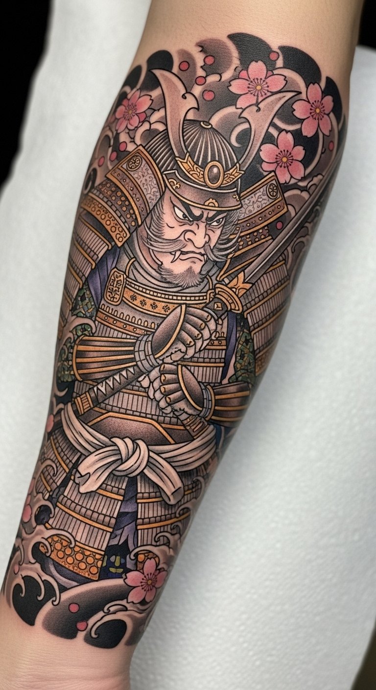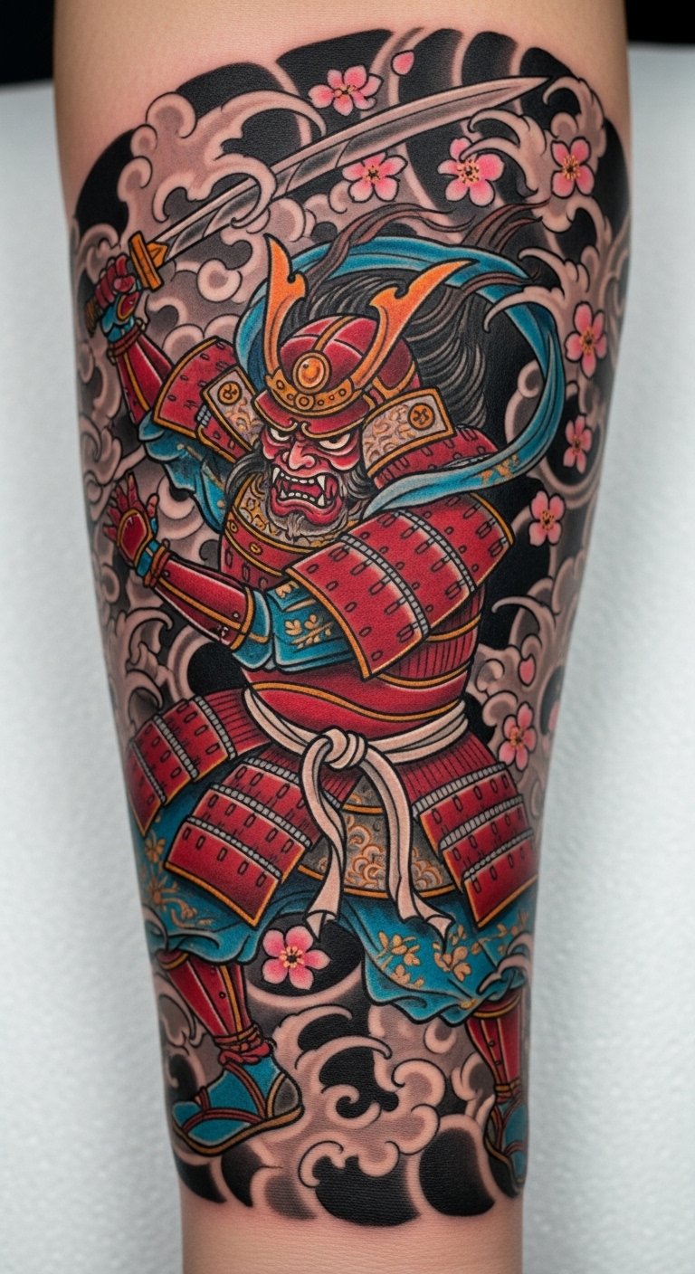 The vibrant colors and intricate designs not only enhance the story behind the tattoo but also connect the wearer to the rich cultural heritage of the samurai, making it a powerful statement of identity and determination.