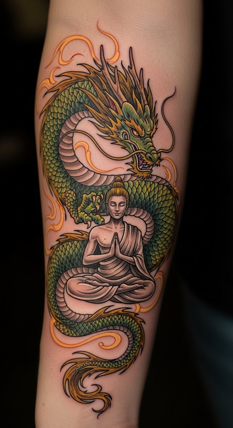 Placed on the forearm, it serves as a constant reminder of the journey towards mastery over body and mind. The dragon represents resilience and clarity, while the meditative figure illustrates the balance achieved through mindful discipline.