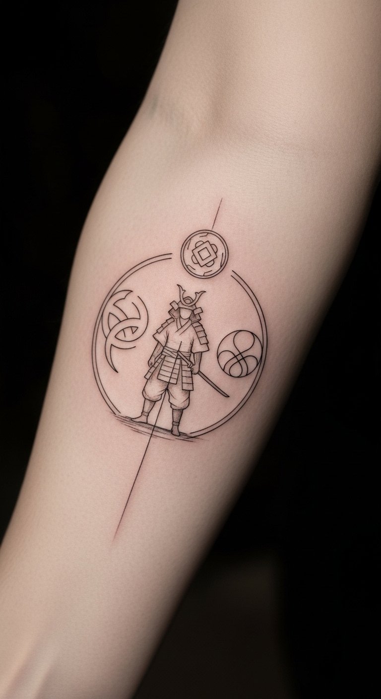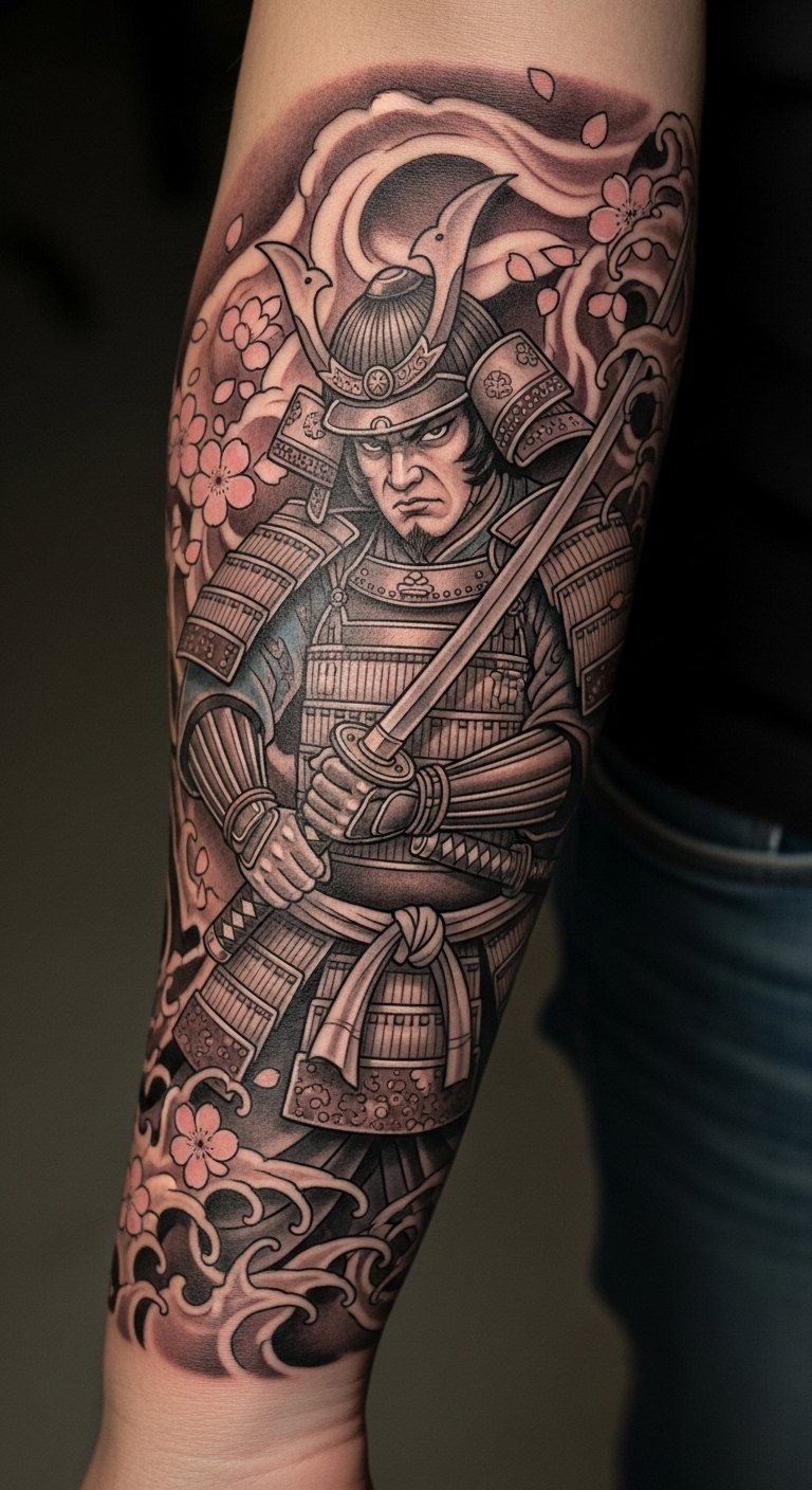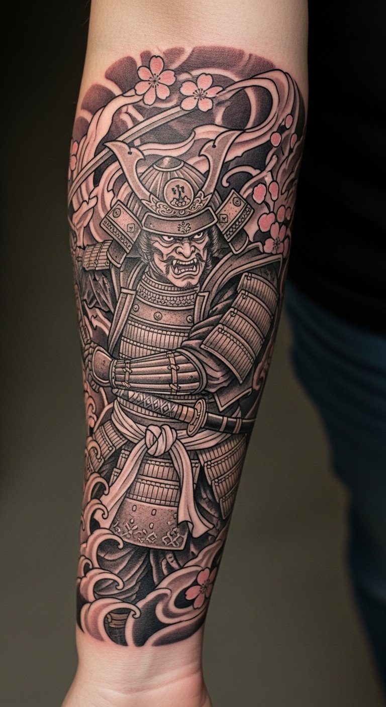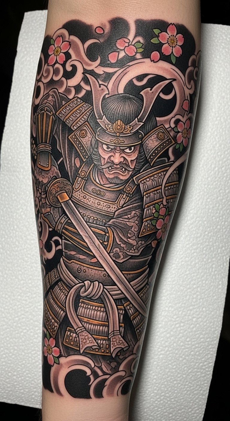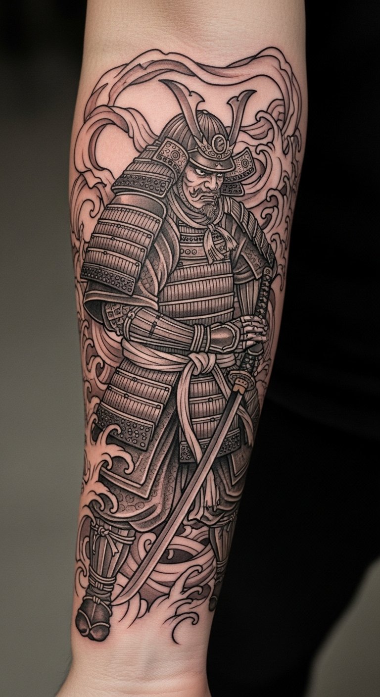 The tattoo embodies the essence of inner strength and wisdom, drawing inspiration from the samurai ethos.