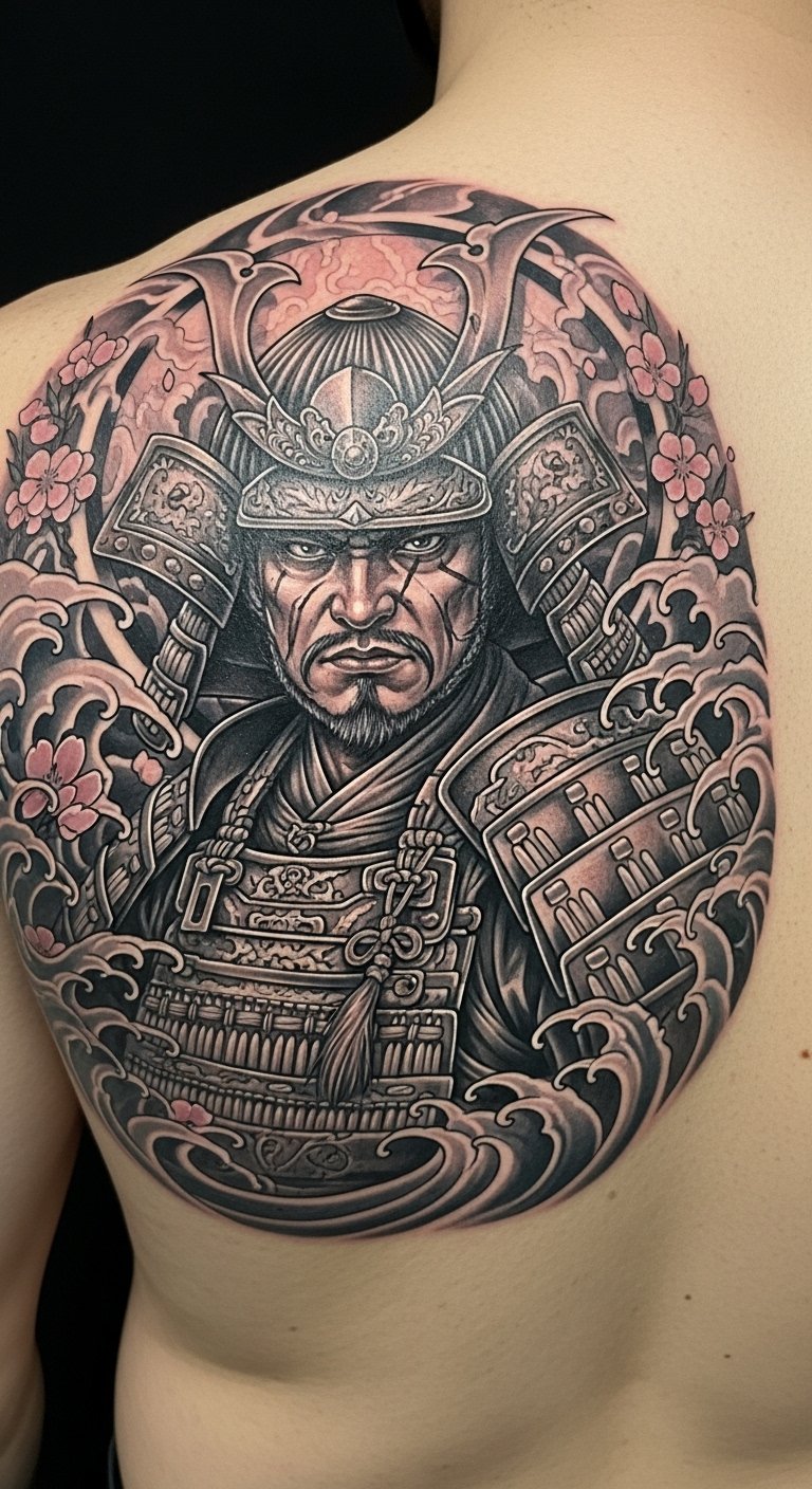 The samurai tattoo on the shoulder blade embodies the noble spirit of the warrior class, symbolizing honor, discipline, and courage. The fierce expression of the samurai reflects an unwavering commitment to these values, while the surrounding cherry blossoms and waves represent the beauty and transience of life.