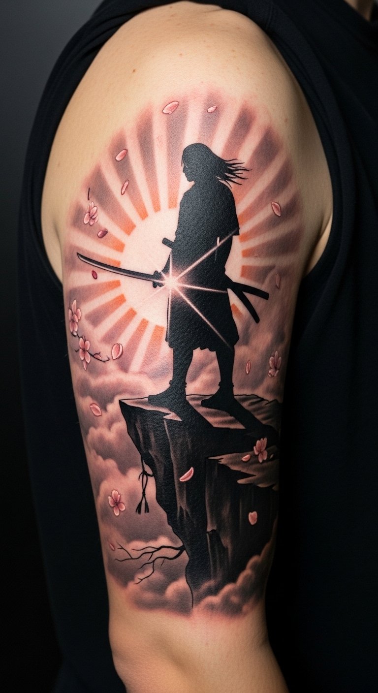This tattoo embodies the ideals of courage, honor, and loyalty, which are central to the samurai ethos. The placement on the forearm allows for visibility, serving as a daily reminder of personal strength and resilience. The cherry blossoms symbolize the beauty of life and the fleeting nature of it, while the rising sun represents hope and new beginnings. Together, these elements create a powerful narrative that inspires the wearer to embrace their journey and values with unwavering determination.