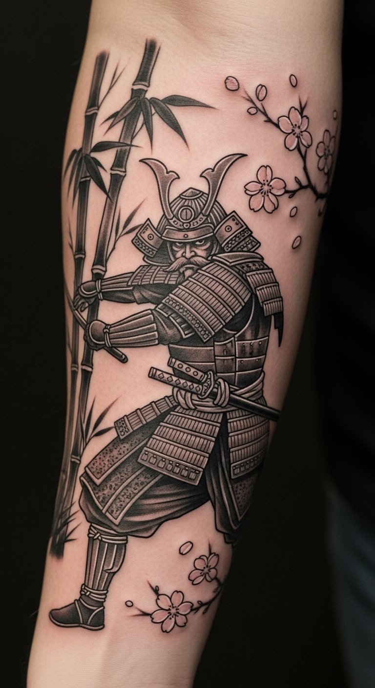 The bamboo and cherry blossoms convey significant cultural narratives, reflecting the samurai’s commitment to honor and discipline.