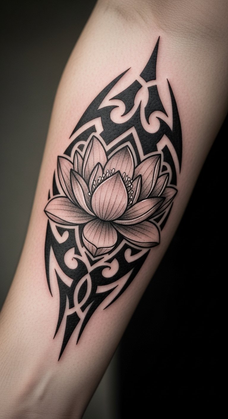 The lotus flower in this tattoo embodies personal growth through adversity, symbolizing beauty that emerges from the mud.