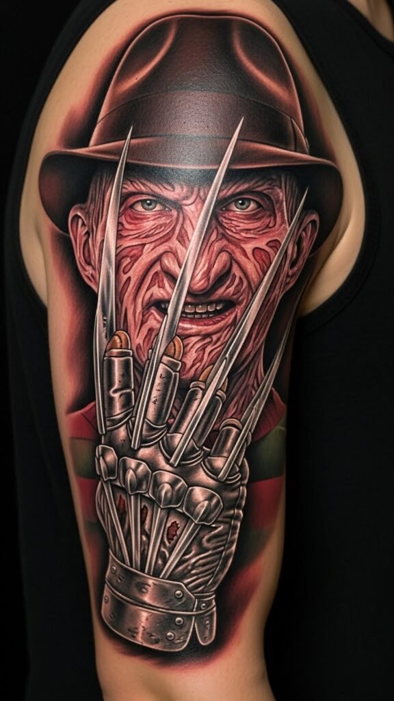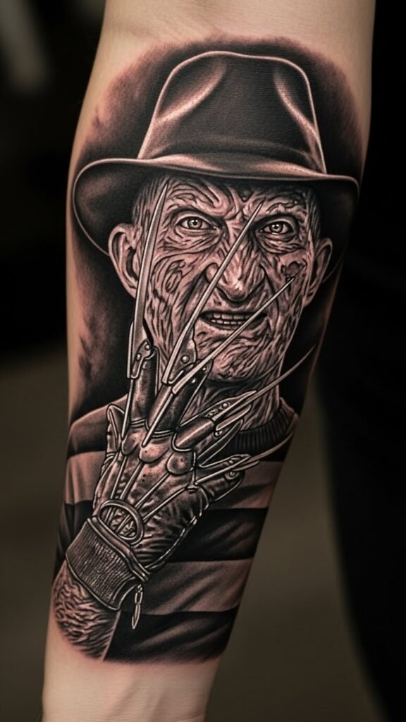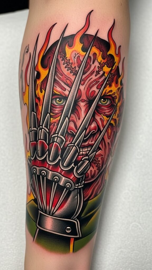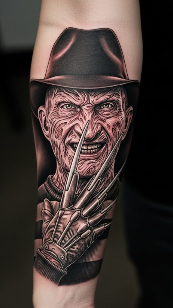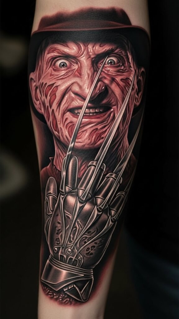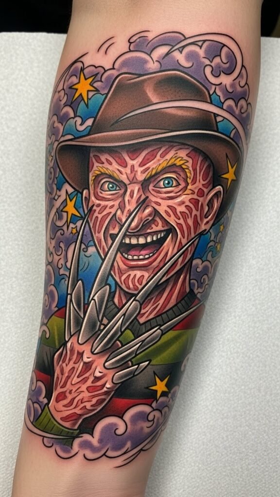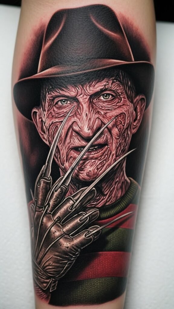 This tattoo concept captures the essence of fear and dark humor inherent in “A Nightmare on Elm Street.”