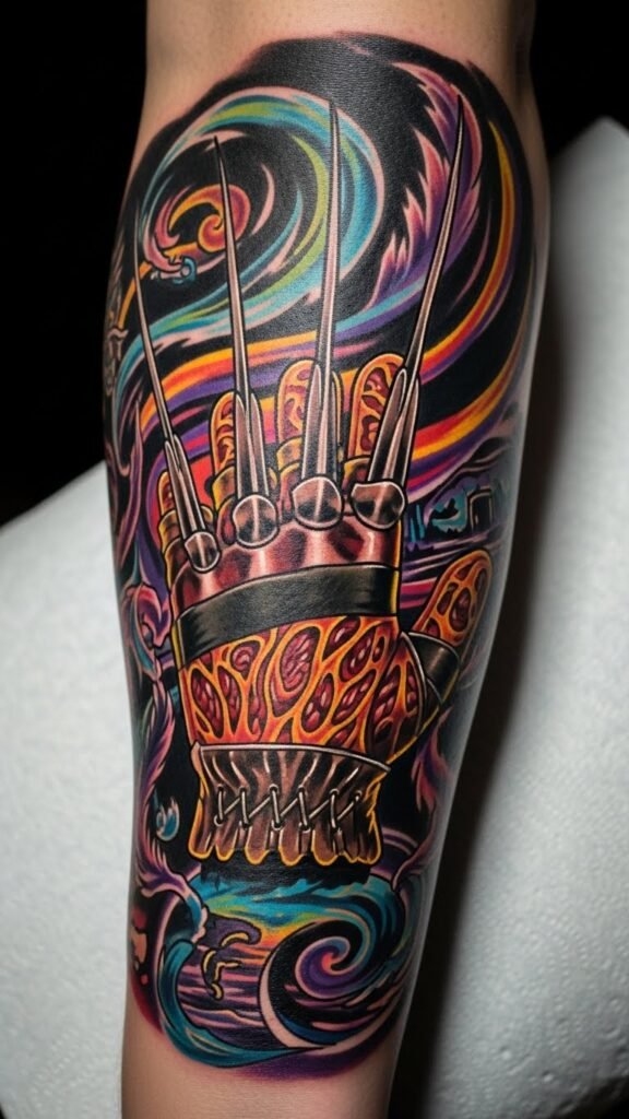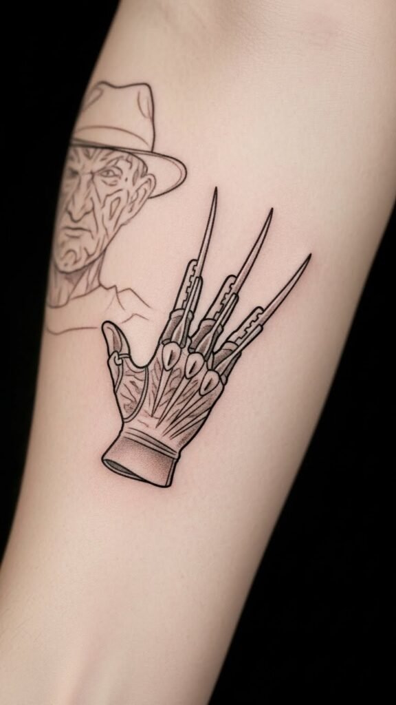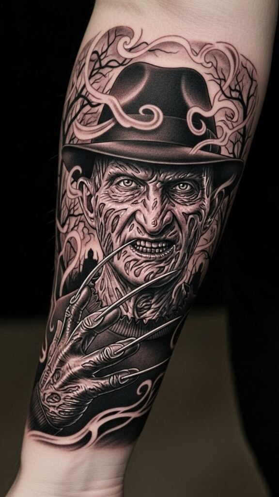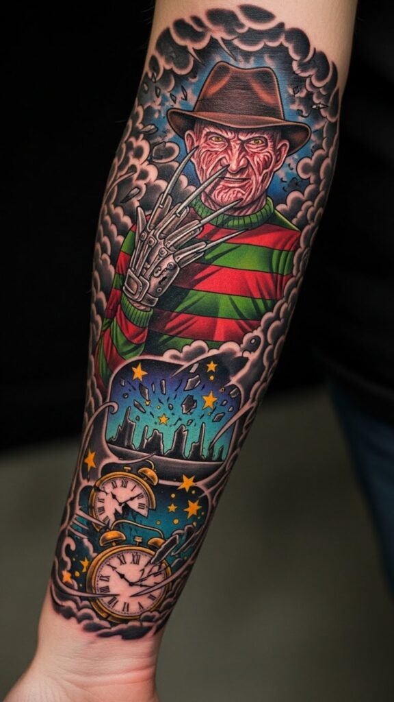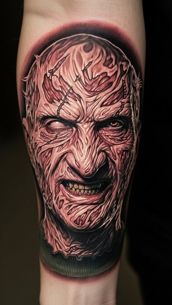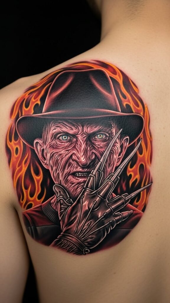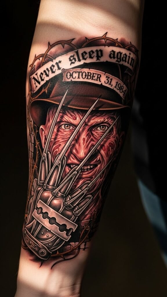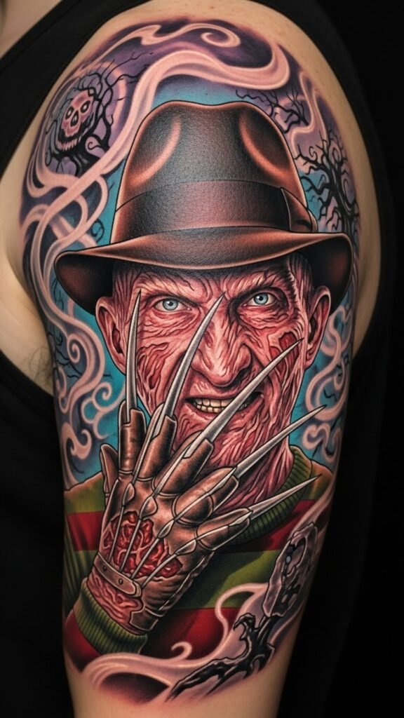 This tattoo concept captures the essence of fear and dark humor inherent in “A Nightmare on Elm Street.”