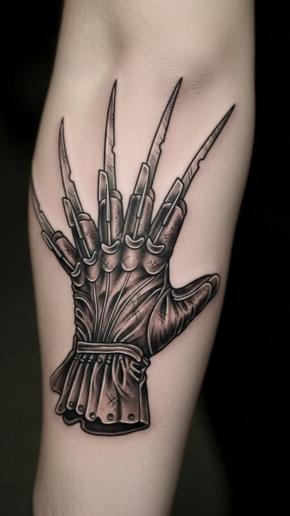 This tattoo symbolizes a fearless embrace of the darker aspects of life, representing not only the lethal intent of Freddy Krueger but also a deep appreciation for horror culture.