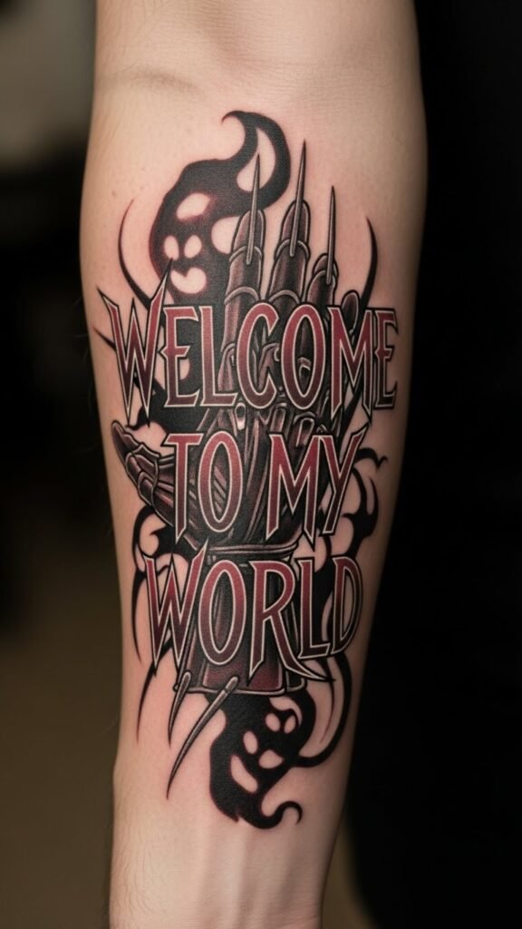 Placed on the forearm, it serves as a bold statement, showcasing a fearless spirit and a deep connection to horror culture. The phrase “Welcome to my world” not only signals an acceptance of the terrifying but also transforms fear into a personal emblem of strength.