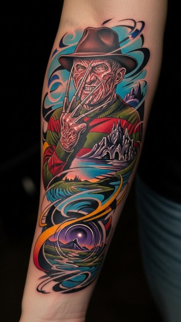 This tattoo symbolizes the embrace of fear and creativity, merging the horror of Freddy with abstract artistry.