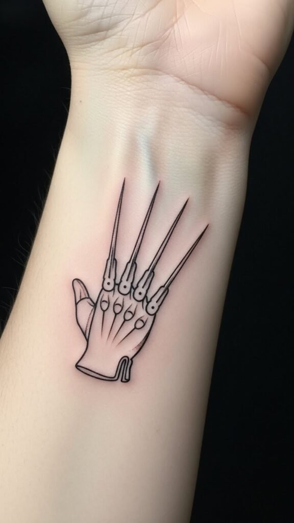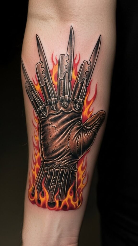 This tattoo design, featuring Freddy Krueger’s iconic glove entwined with flames, symbolizes the wearer’s journey through trauma and their emergence into strength and resilience.