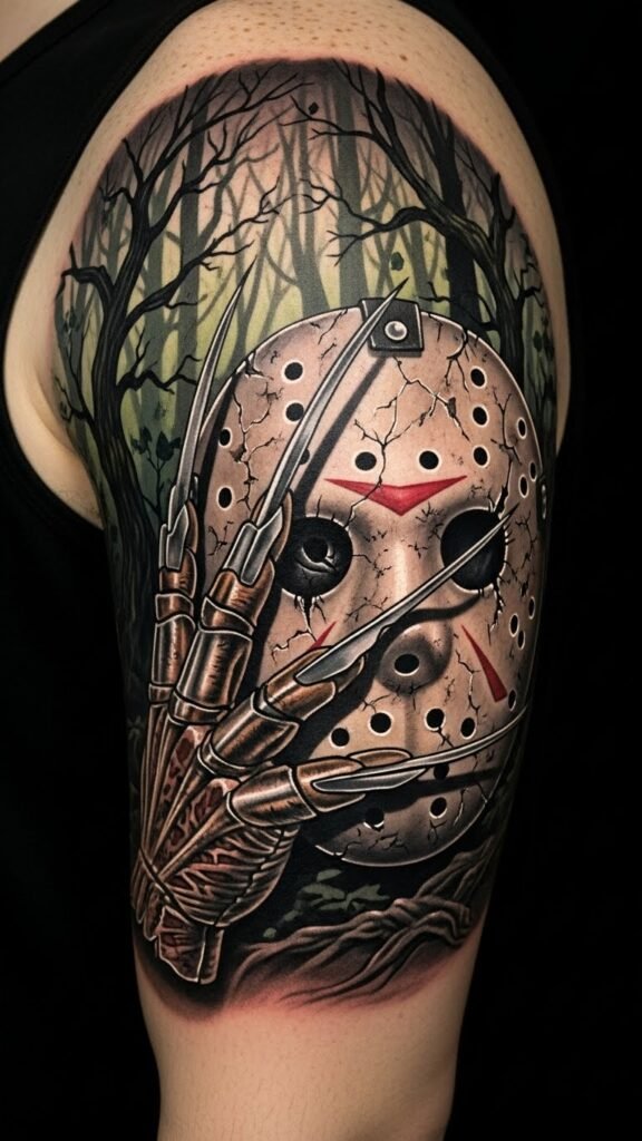 This tattoo represents the ultimate clash of horror icons, blending Freddy’s dream manipulation with Jason’s relentless pursuit.