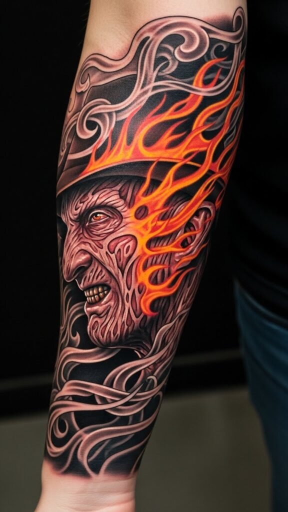 In this tattoo, the flames symbolize Freddy’s intense rage and destructive power, while the smoke represents the elusive and haunting essence of dreams.