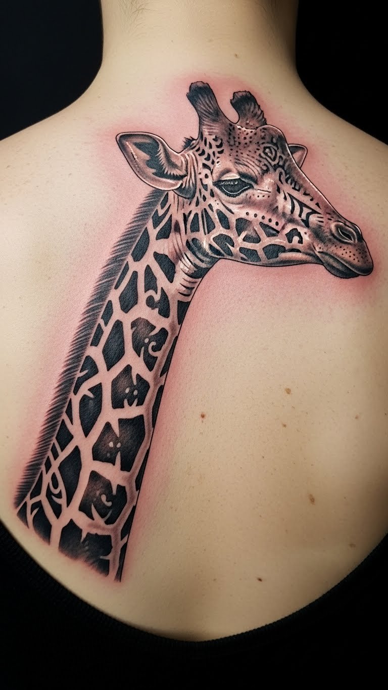 The giraffe tattoo symbolizes vision and leadership, embodying strength and foresight.