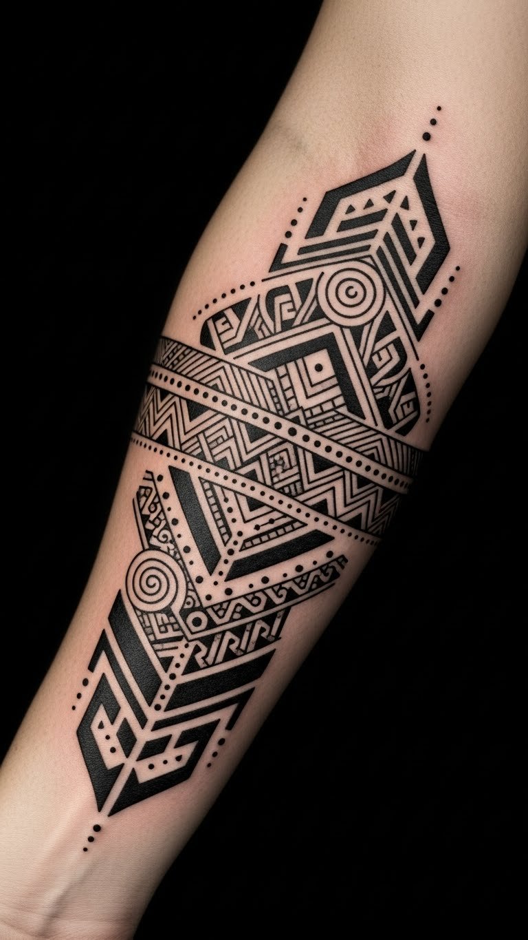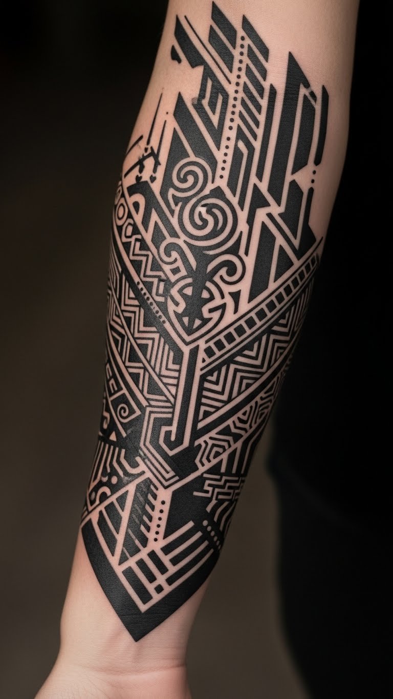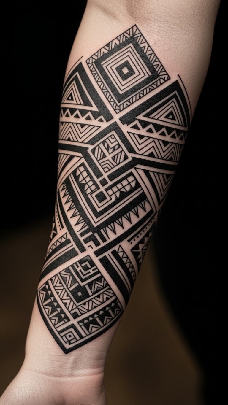 The blackwork tattoo on the forearm symbolizes strength and resilience, with each geometric shape representing different facets of life’s journey.