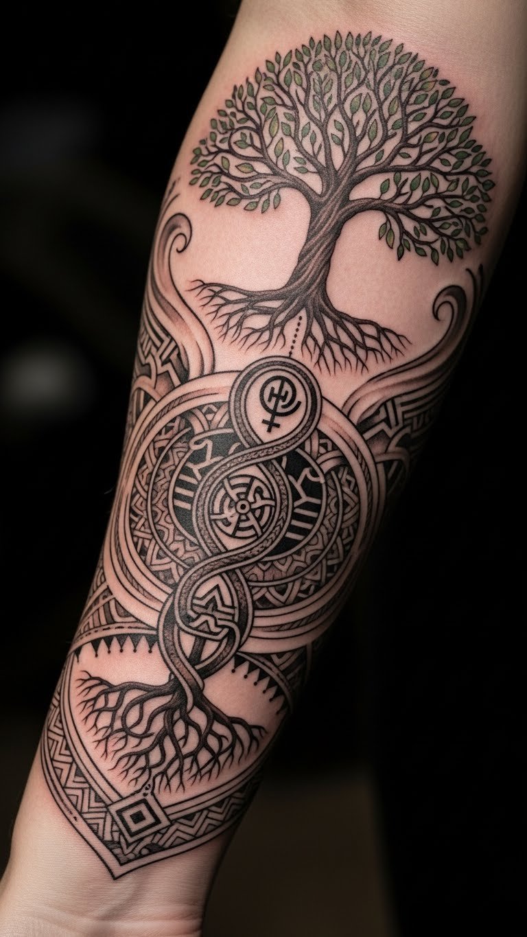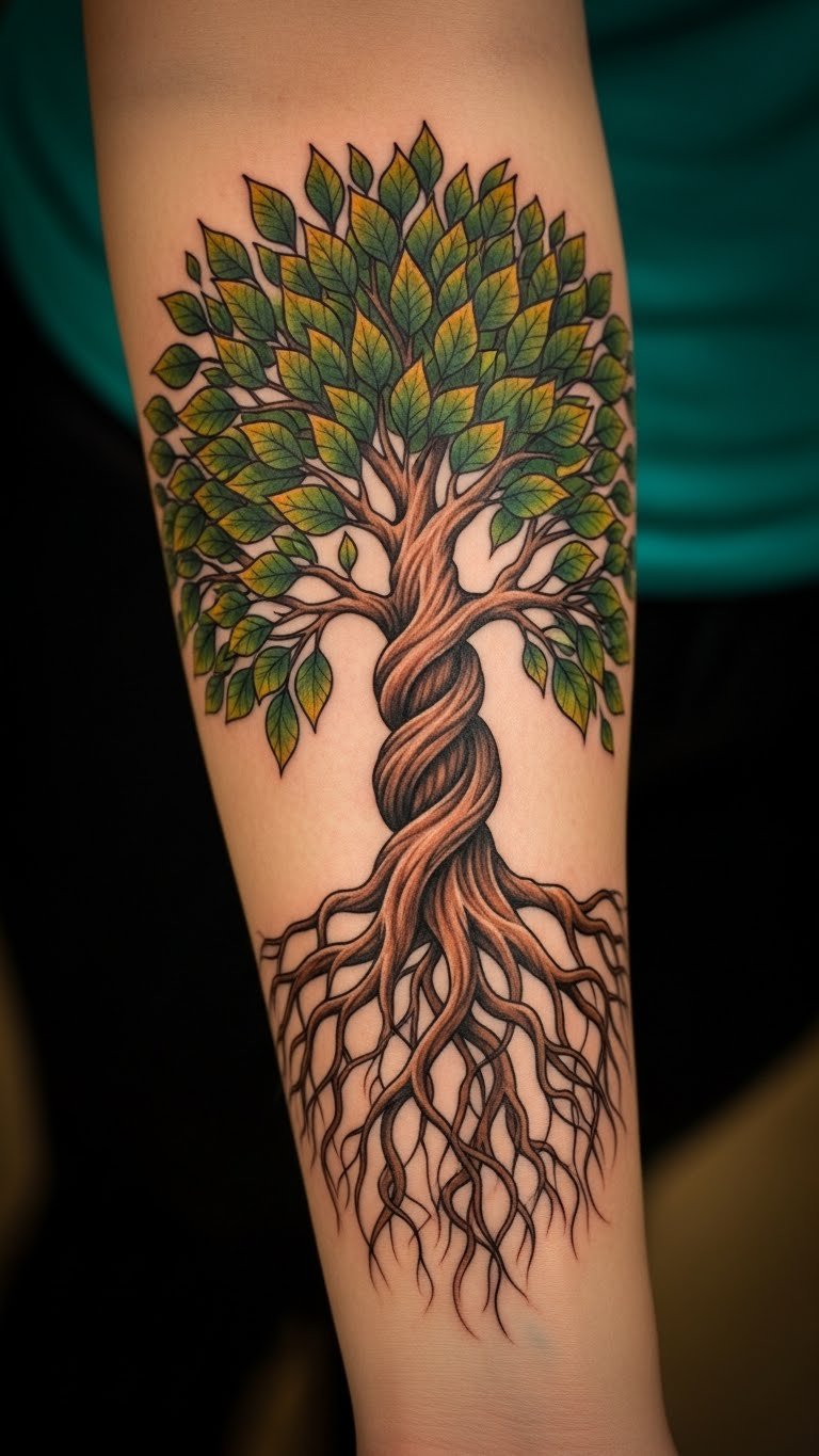 This tattoo serves as a profound connection to one’s roots and heritage, thoughtfully placed on the forearm for visibility and personal expression.
