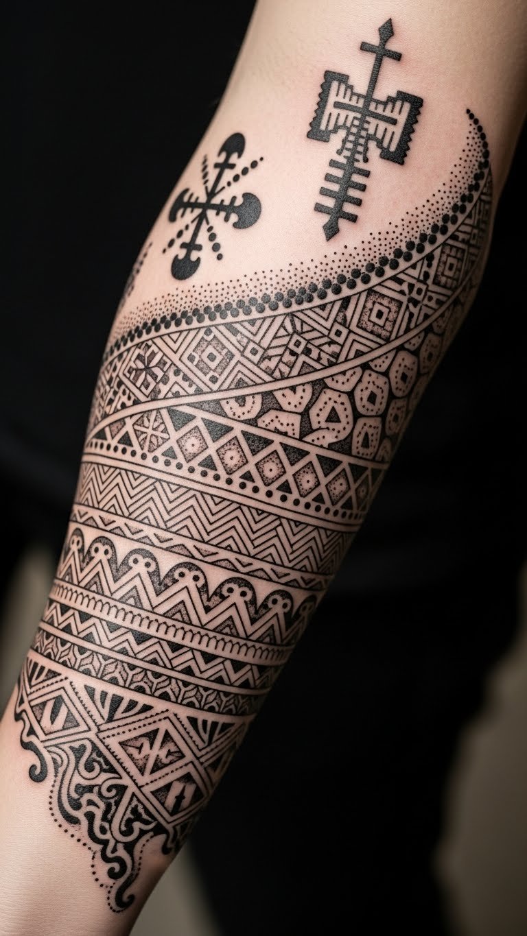 The geometric patterns on the forearm symbolize a deep connection to cultural heritage and personal identity, embodying the wearer’s story and social status.