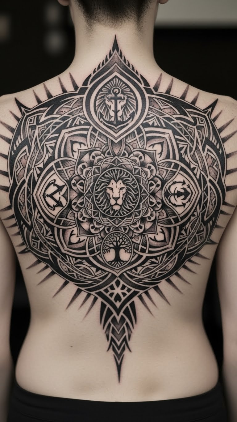 Positioned on the upper back, it serves as a reminder of inner strength and resilience, with the intricate tribal patterns echoing ancestral connections.