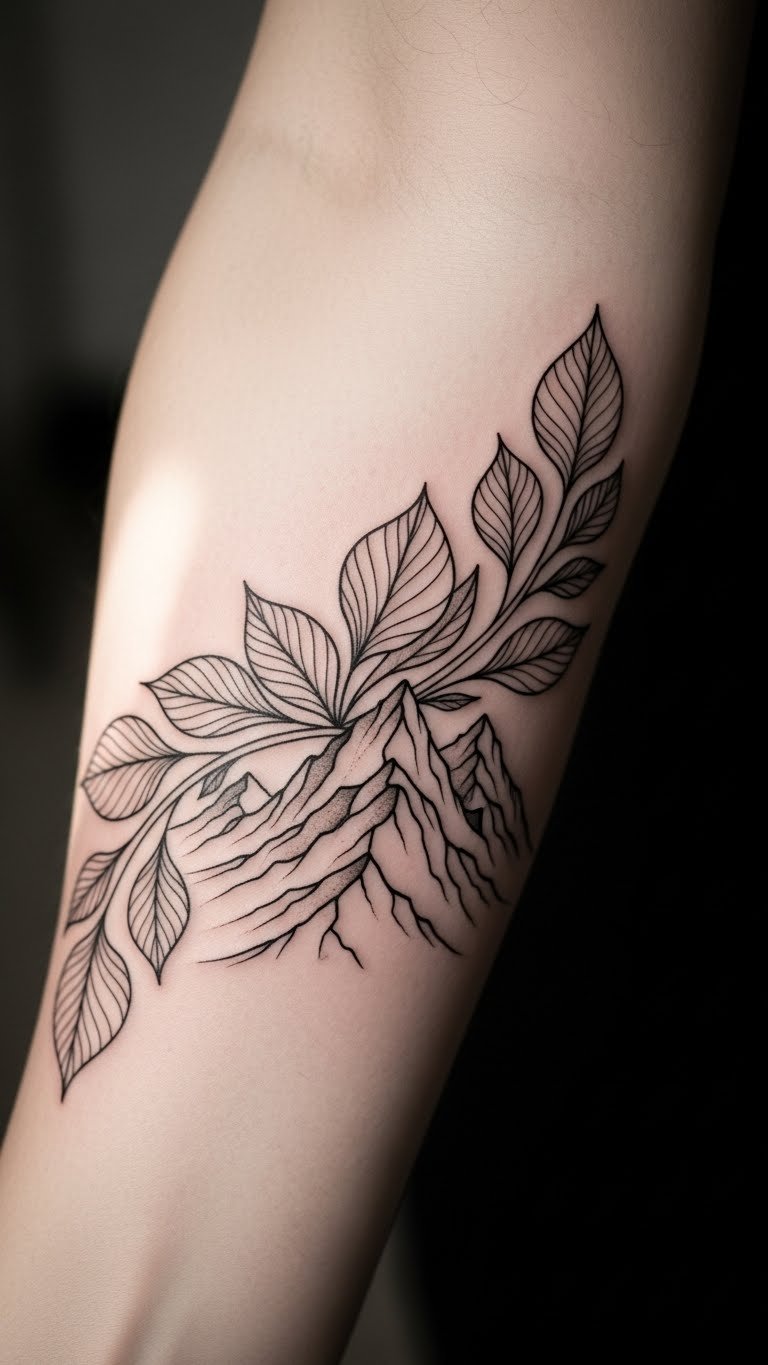 The intricate leaf patterns represent renewal and the cycles of life, while the majestic mountains signify strength and freedom.