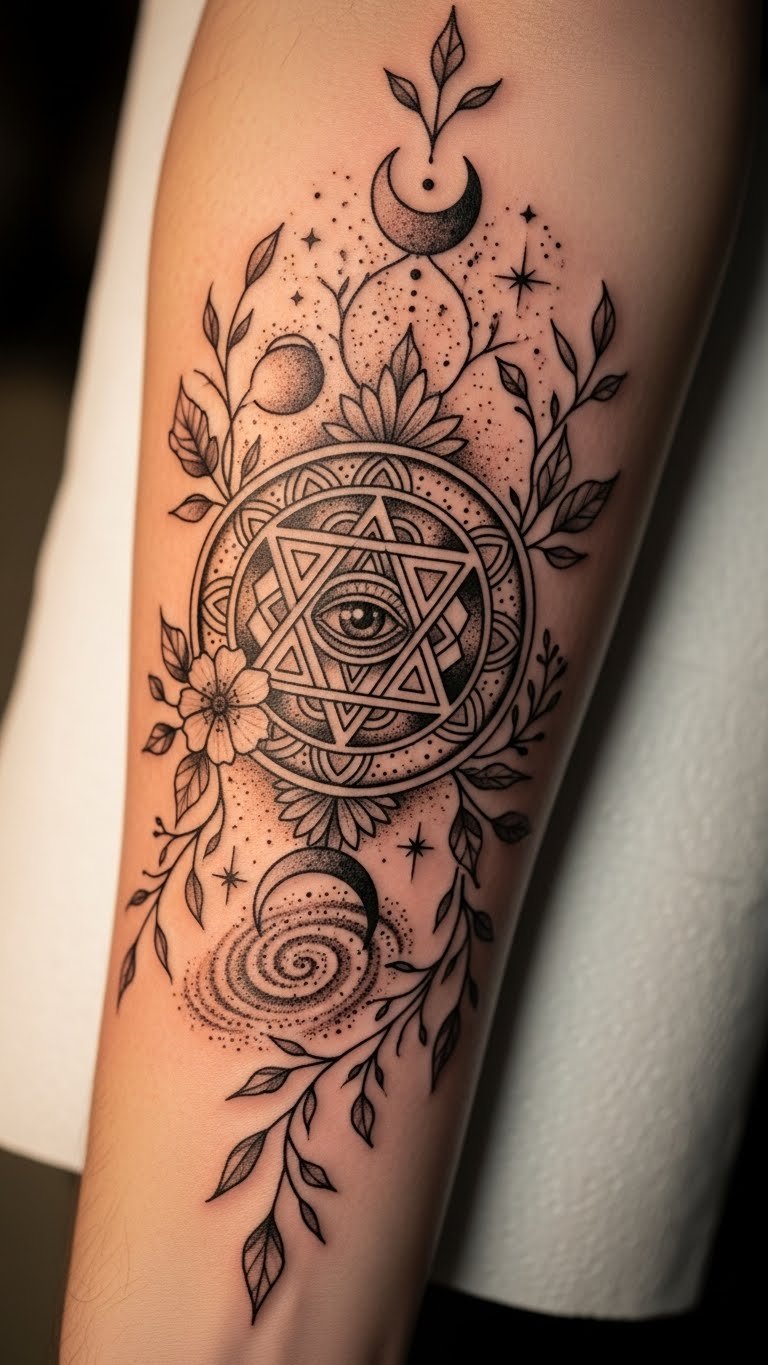 This tattoo concept symbolizes spiritual protection and personal empowerment through its mandala structure, representing harmony and unity.