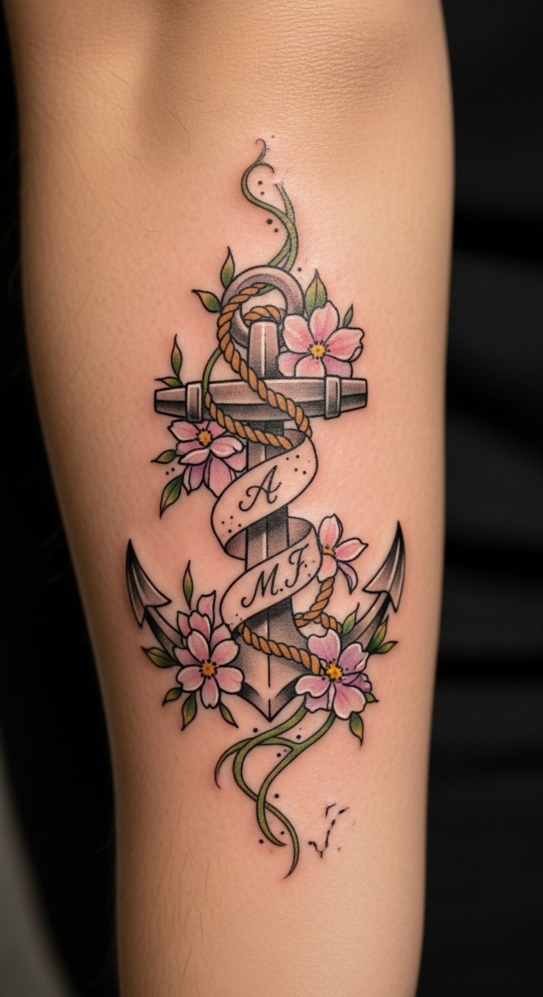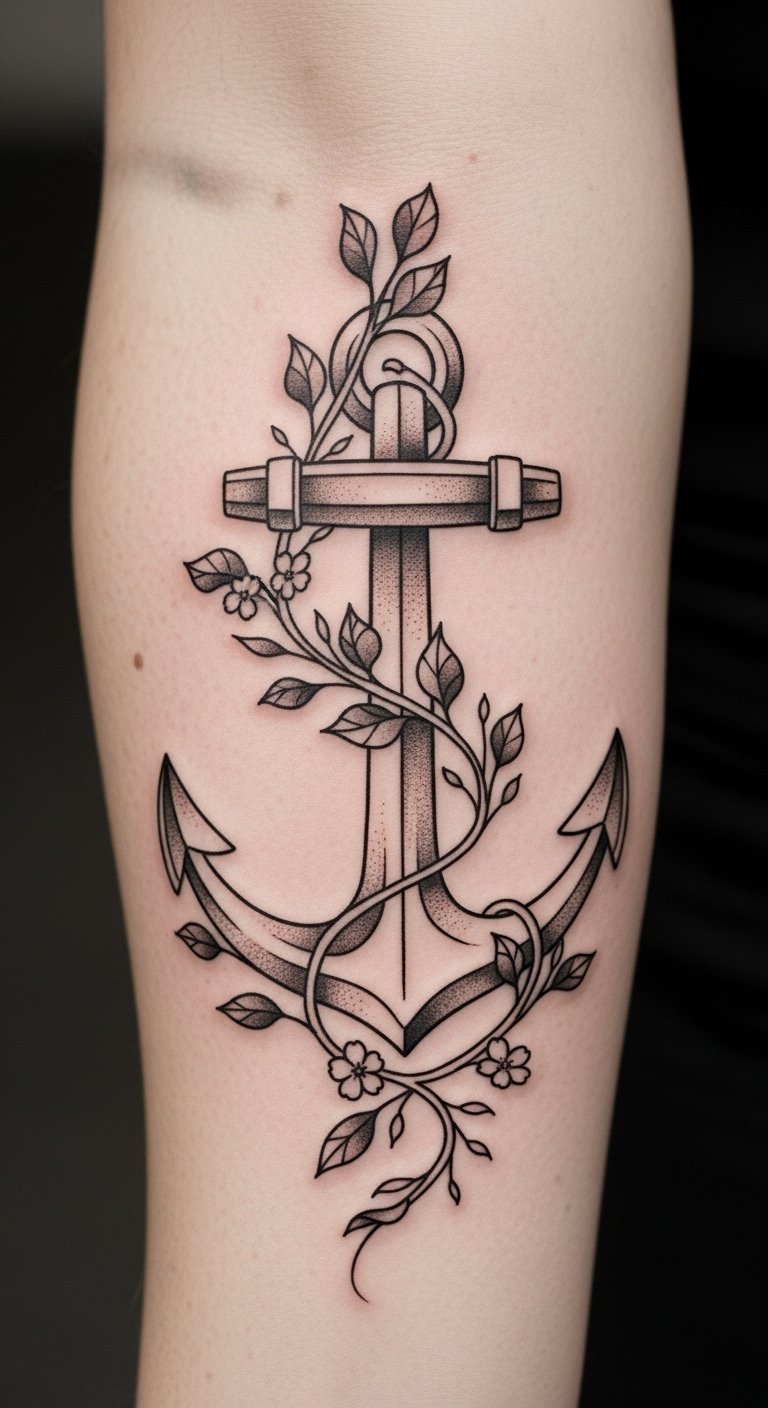 This tattoo symbolizes stability and hope, as the anchor is often associated with grounding and resilience.