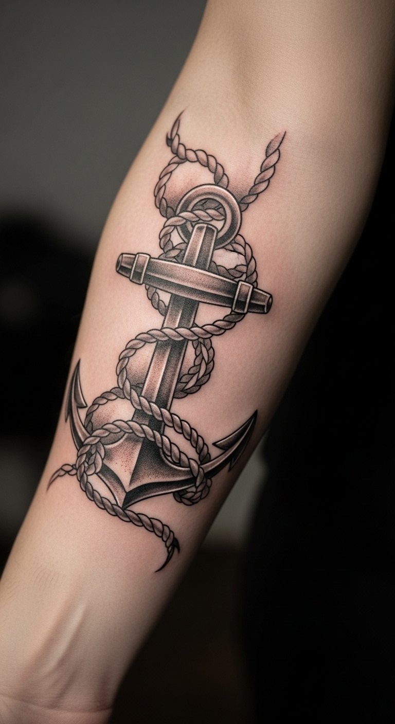 The visibility of the tattoo on the forearm allows for personal expression, inviting conversation and connection with others who appreciate the rich history and emotional weight carried by the anchor’s symbolism.