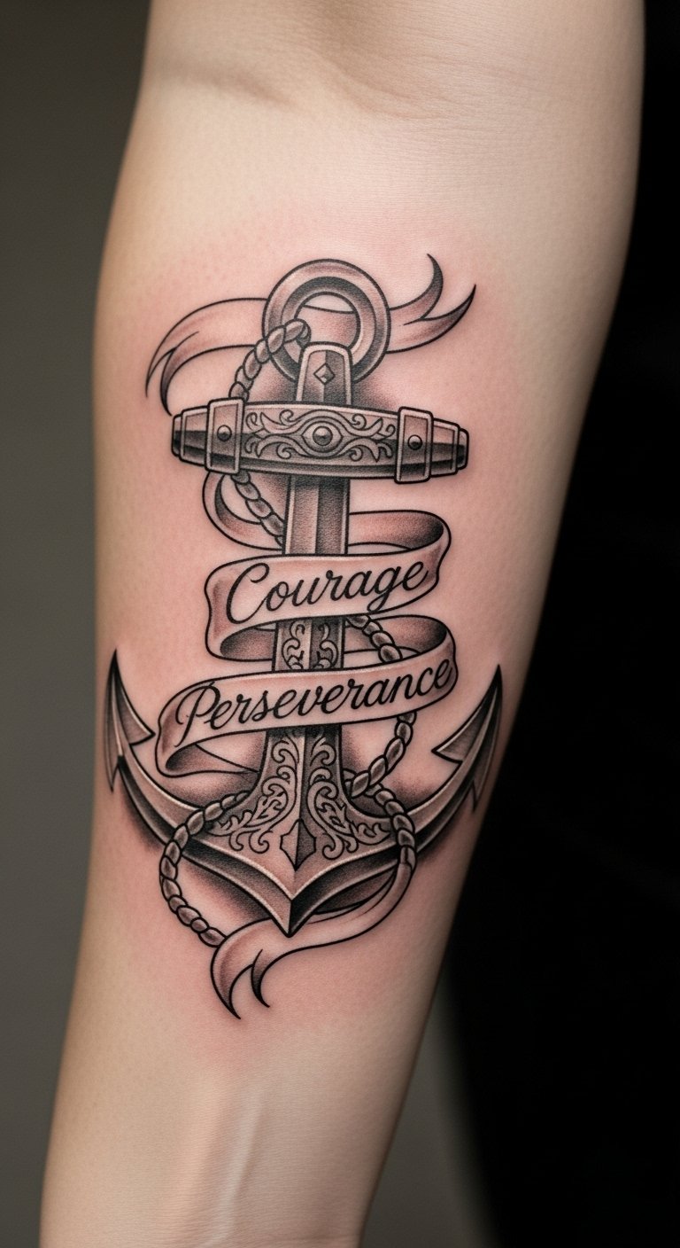 This anchor tattoo on the forearm serves as a constant reminder of personal empowerment and the ability to overcome adversity.