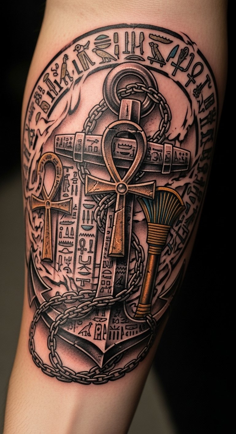 The anchor’s intertwined design with Egyptian symbols evokes a sense of connection to a rich legacy, inspiring the wearer to embrace their strength and find tranquility in challenging times.