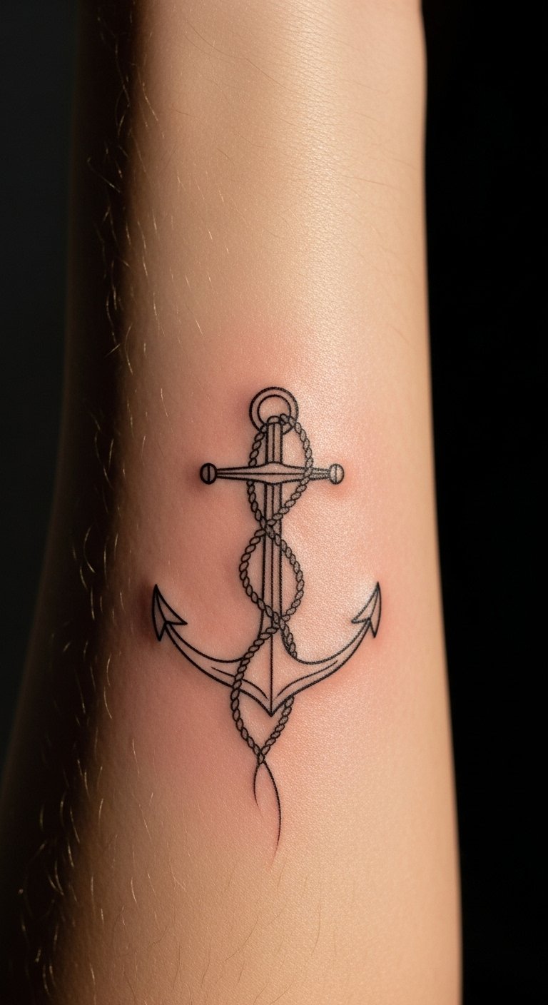 This anchor tattoo, placed on the forearm, symbolizes safety, resilience, and the enduring spirit of seafaring life.