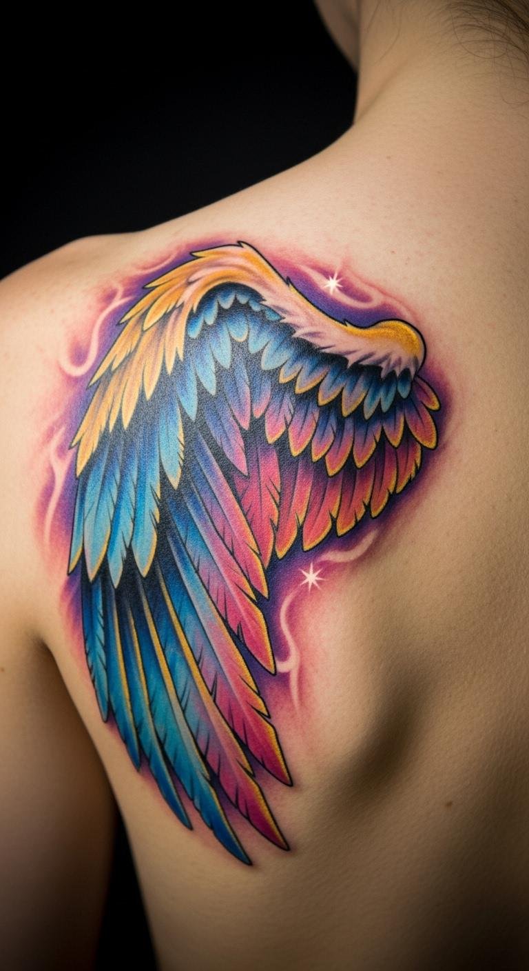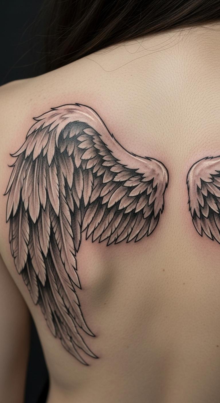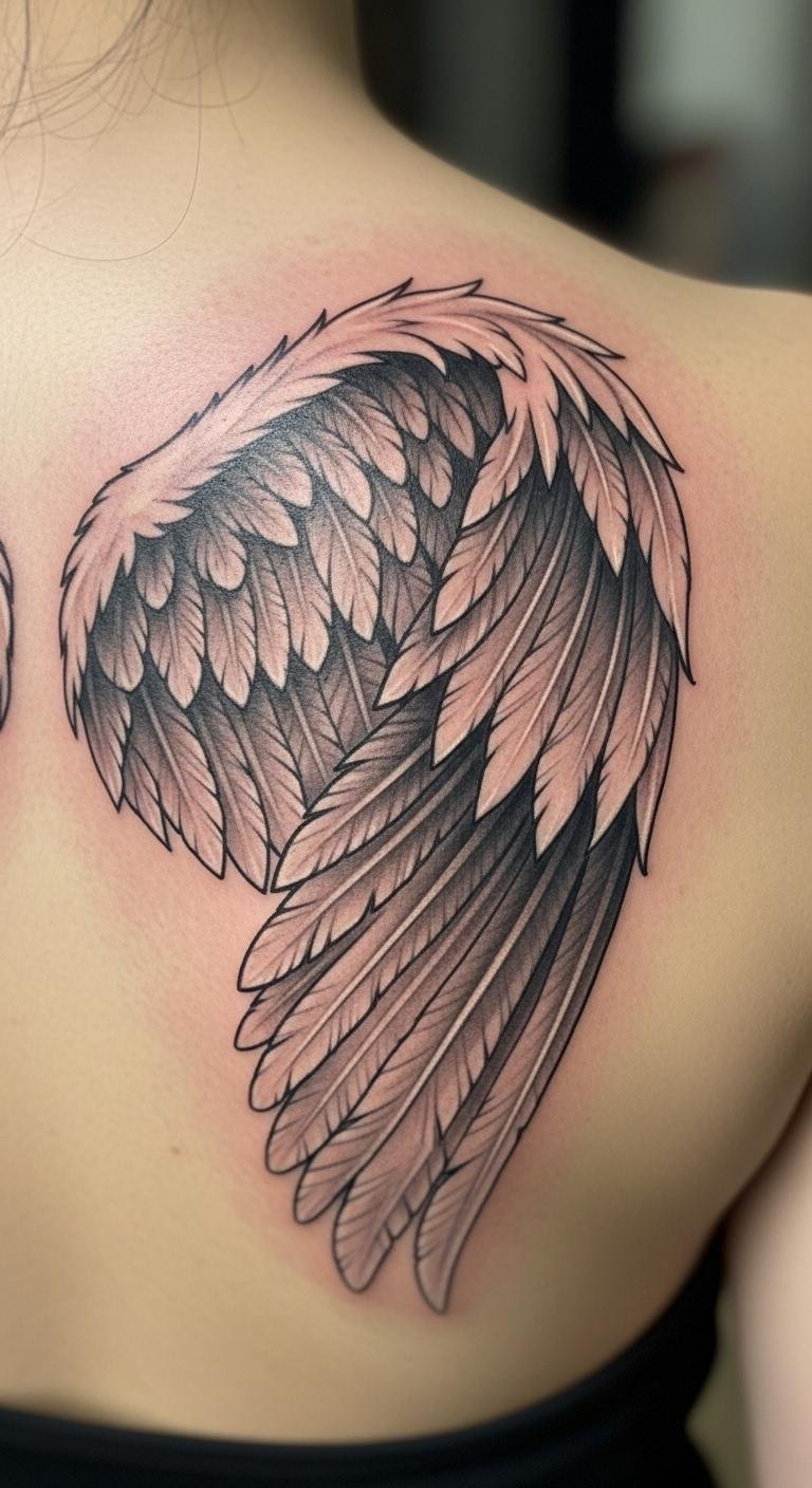 This angel wing tattoo symbolizes freedom and resilience, capturing the essence of personal journeys and emotional strength.