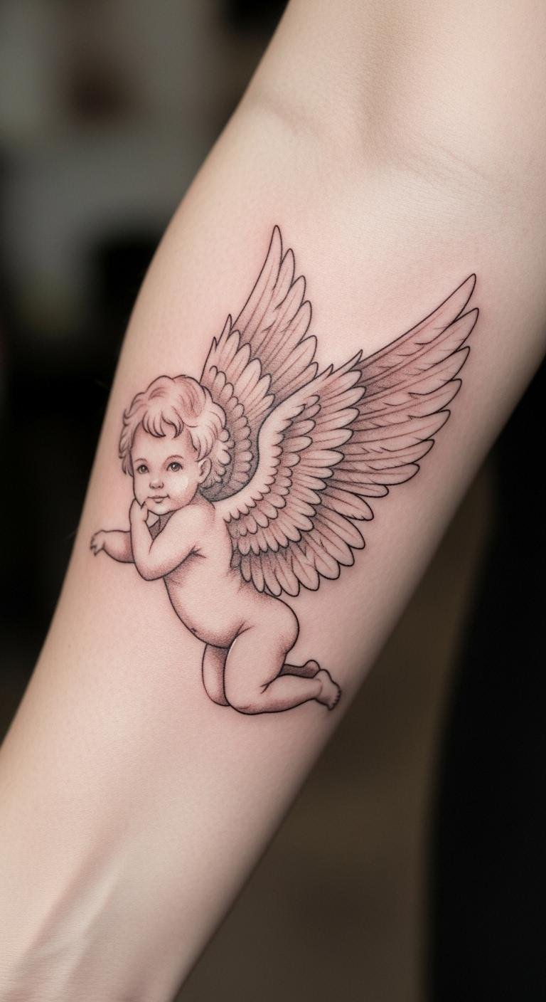 The cherub and baby angel wings tattoo embodies innocence and purity, serving as a gentle reminder of love and protection.