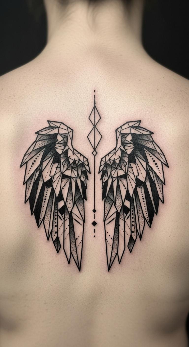 This tattoo symbolizes innocence and protection, reflecting the essence of cherubs and baby angel wings while incorporating a modern geometric twist.