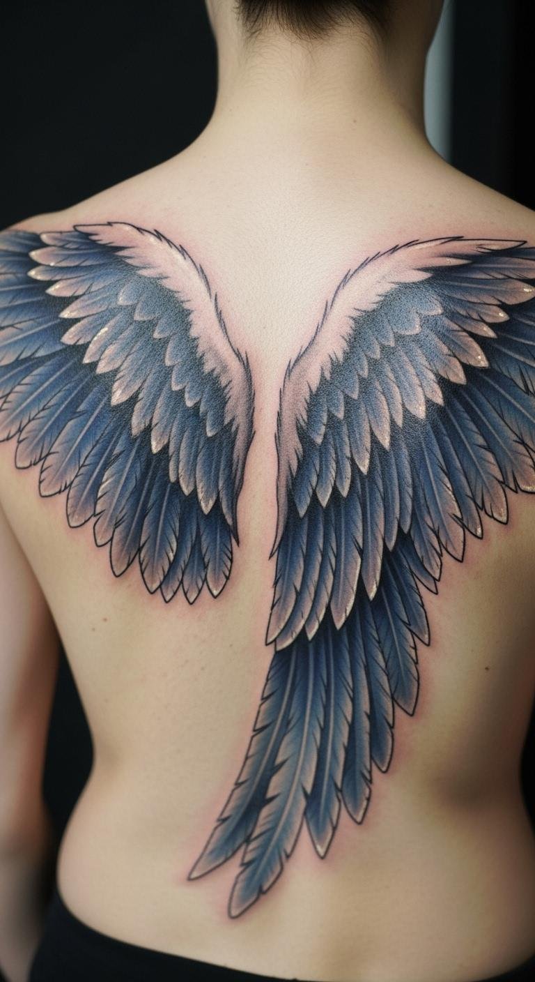 The angel wings tattoo symbolizes freedom, protection, and spiritual transcendence, reflecting the wearer’s personal journey and inner strength.