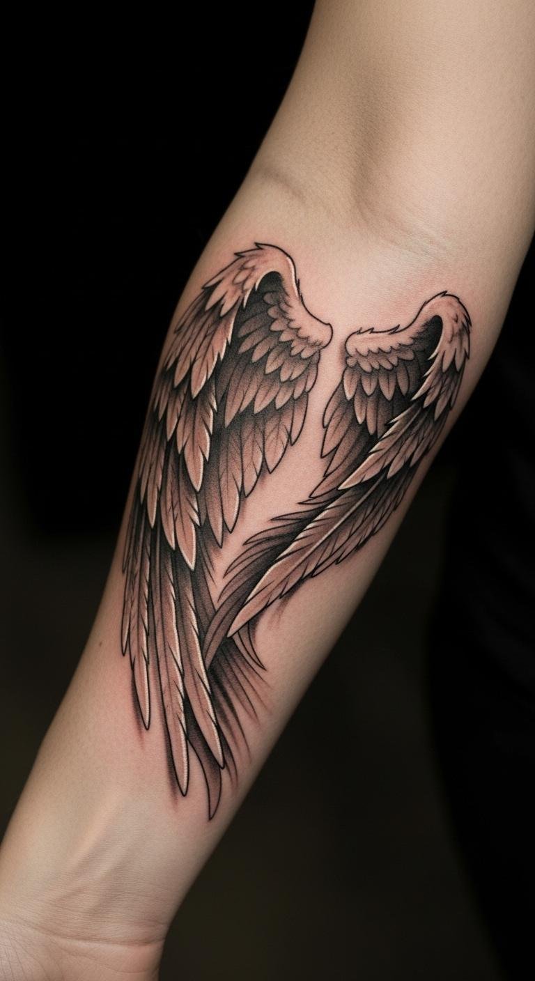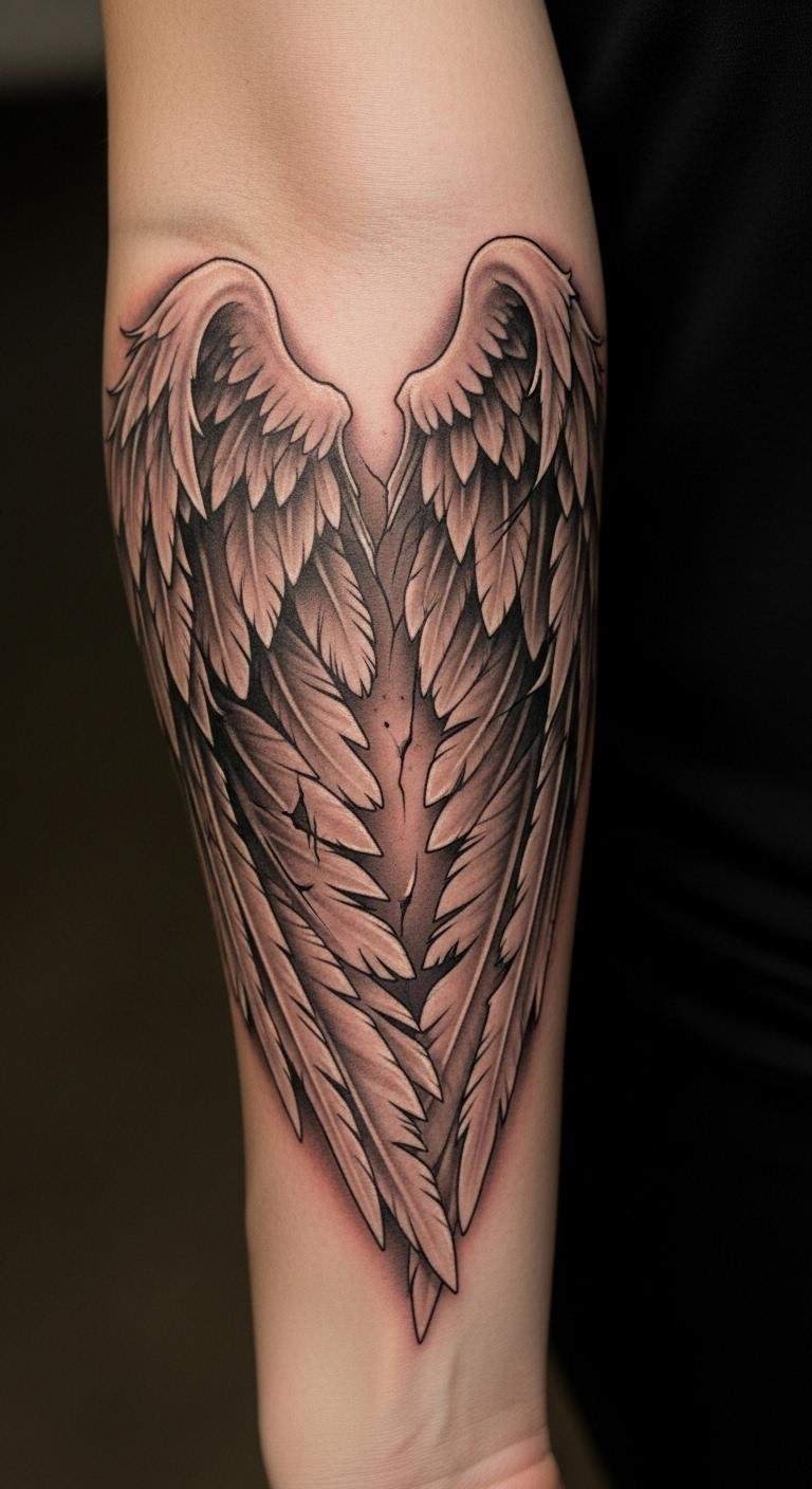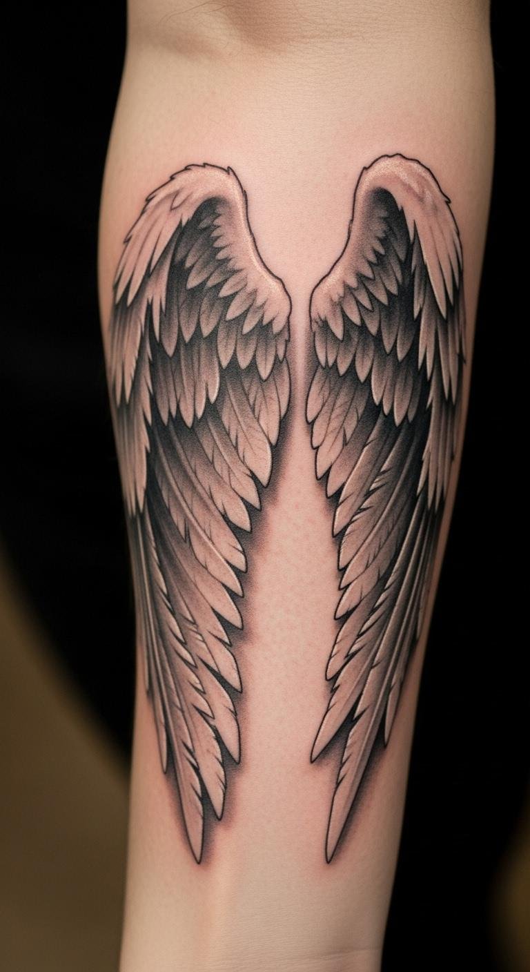 The angel wings tattoo on the forearm symbolizes freedom, protection, and spiritual guidance, serving as a constant reminder of inner strength.