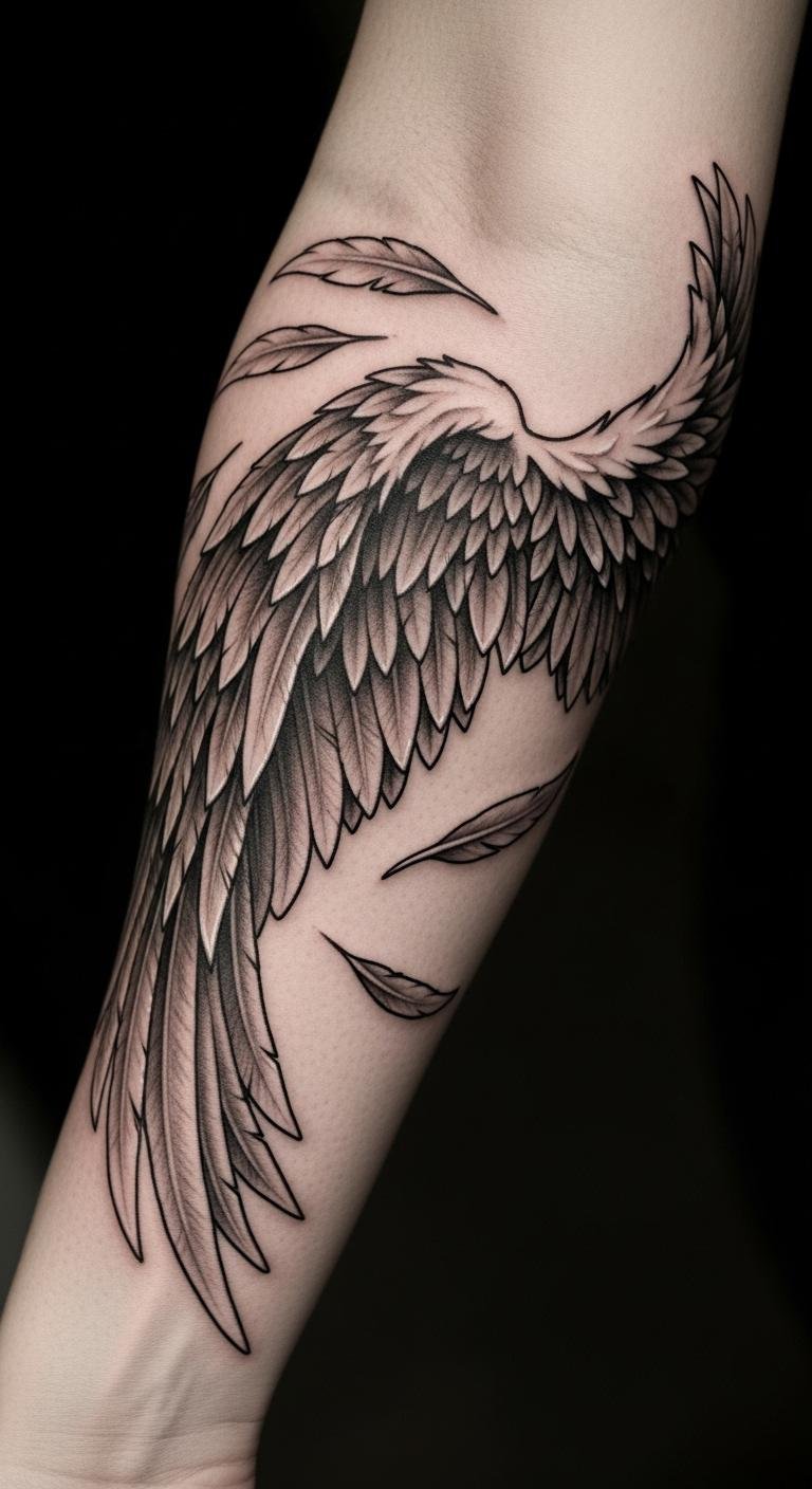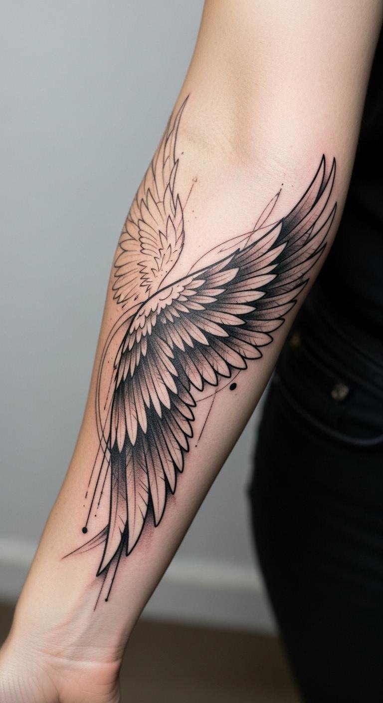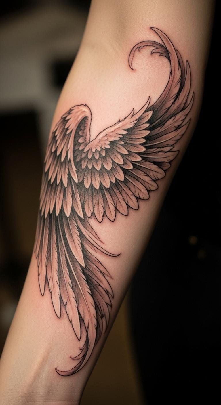 The angel wings tattoo on the forearm symbolizes freedom, protection, and spiritual guidance, serving as a constant reminder of inner strength.