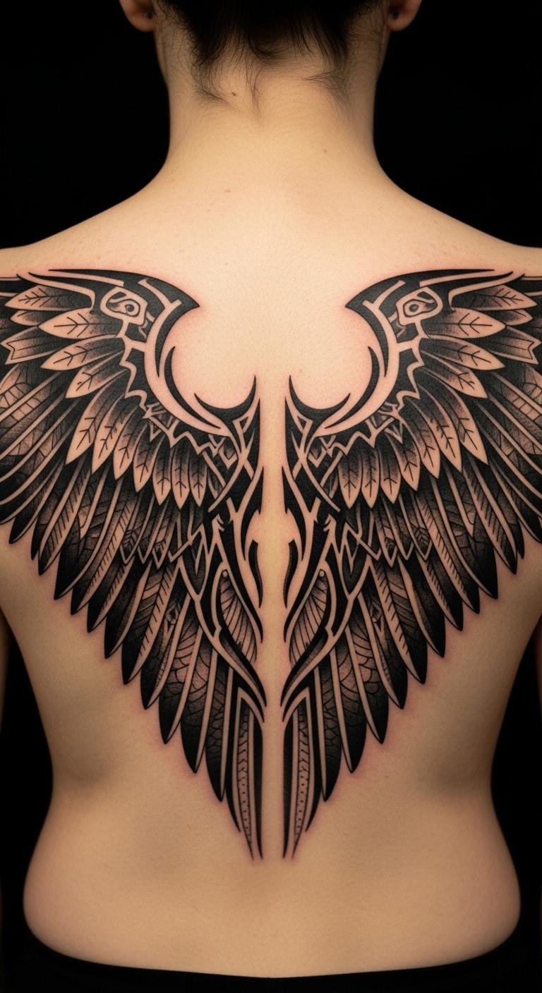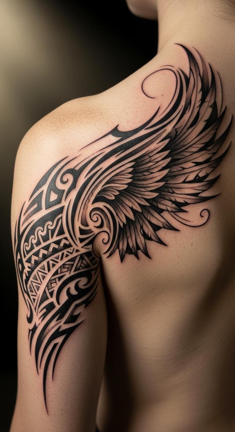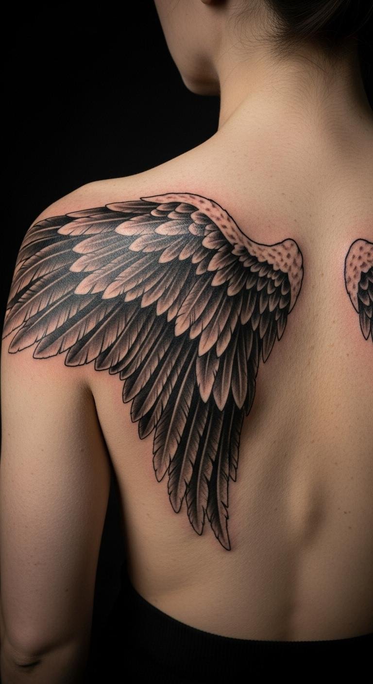 The placement on the shoulder blade and upper back allows for a sense of openness and freedom, embodying the spirit of flight and personal growth.