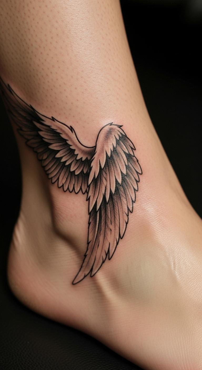 The ankle wing tattoo symbolizes personal freedom and resilience, representing the wearer’s journey through life.