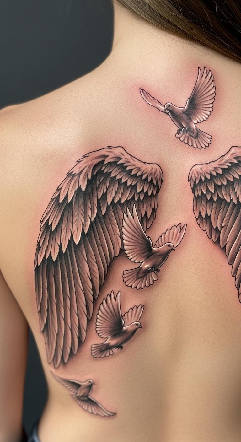 The combination of angel wings and doves in this tattoo serves as a powerful emblem of hope, spiritual guidance, and protection.