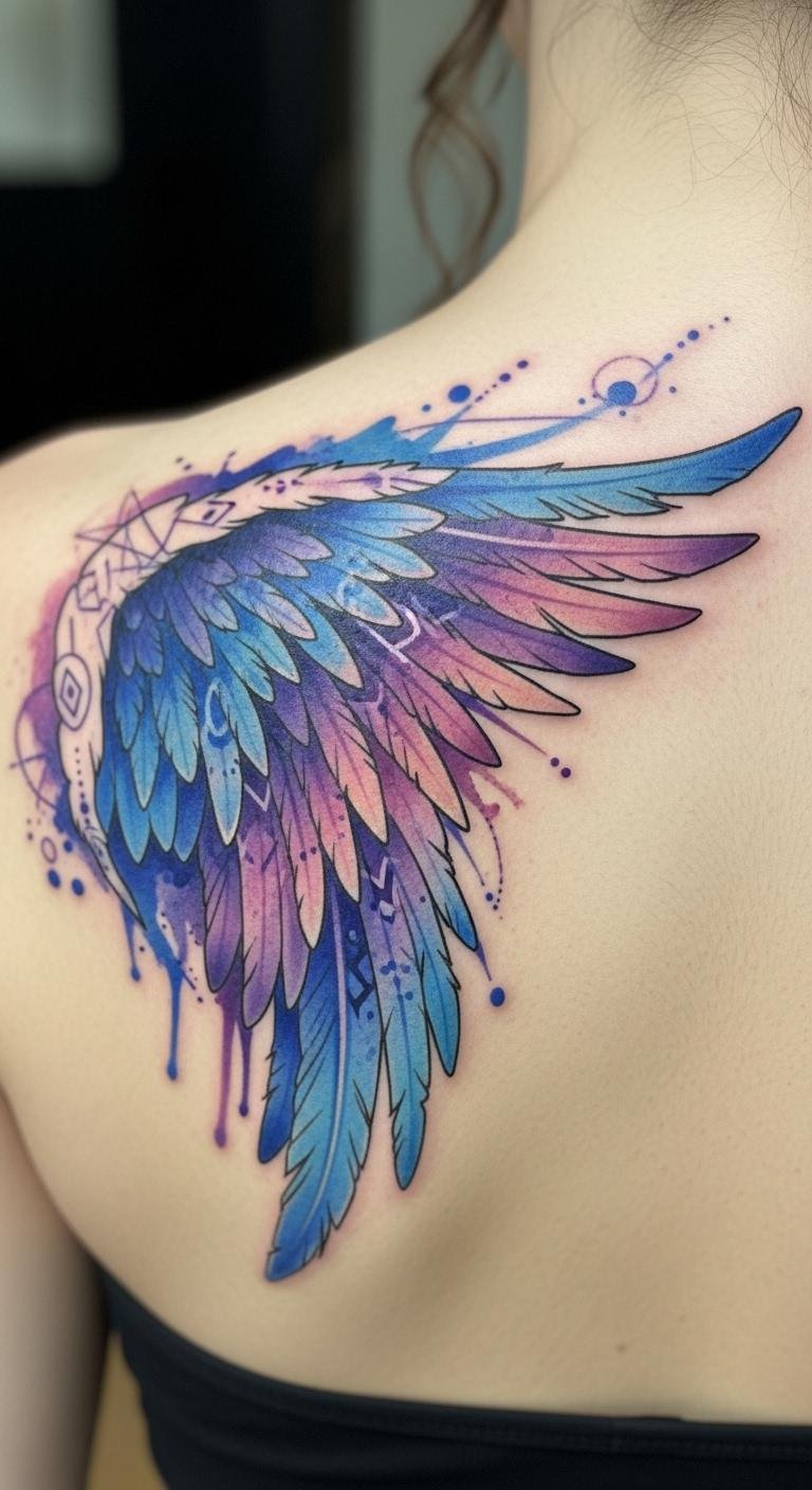 The watercolor angel wings tattoo symbolizes protection, freedom, and the potential for the spirit to soar.