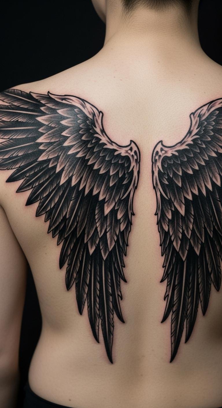 The large back angel wing tattoo symbolizes freedom, resilience, and personal growth, acting as a powerful reminder of one’s connection to the divine.