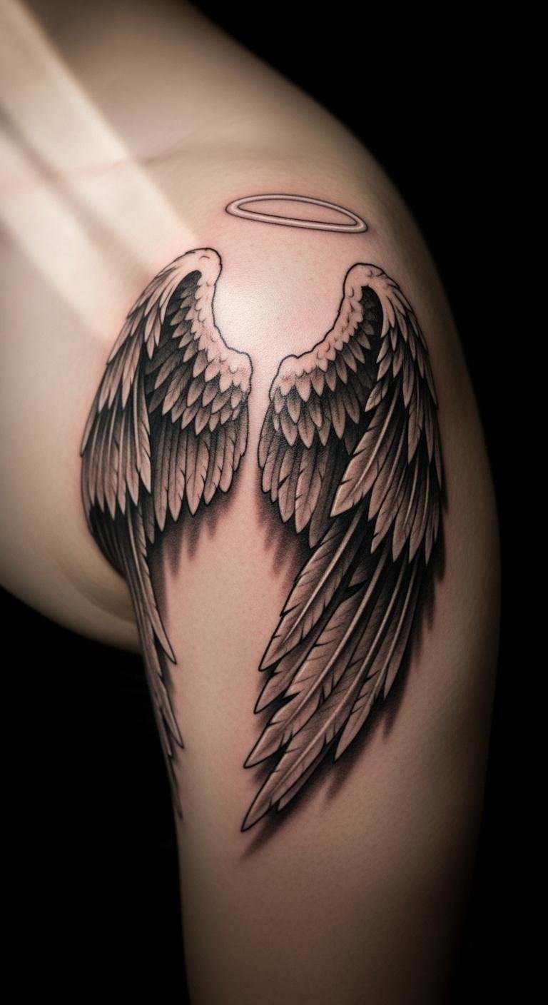 The tattoo of angel wings with halos embodies profound symbolism, representing protection, freedom, and divine guidance.