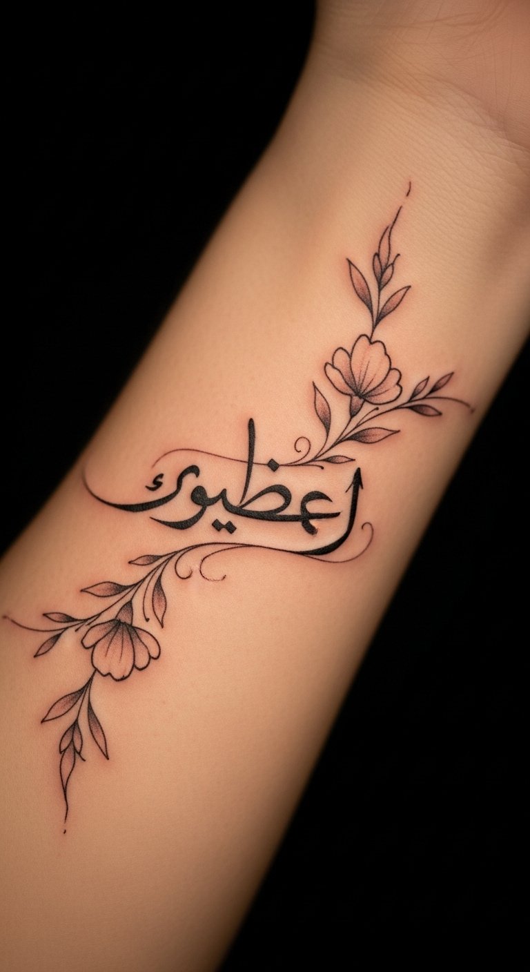 The Diwani calligraphy tattoo on the forearm symbolizes a deep appreciation for art and culture, reflecting the wearer’s passion for beauty and personal narrative.