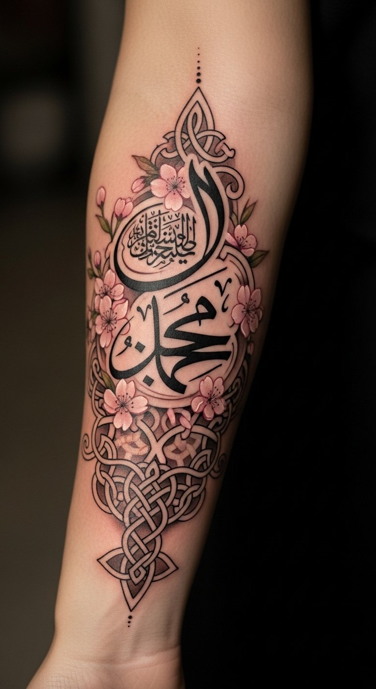 This tattoo embodies a fusion of cultures, where Arabic calligraphy symbolizes beauty and spirituality, while the cherry blossoms represent the transient nature of life, and Celtic knots reflect eternity and interconnectedness.