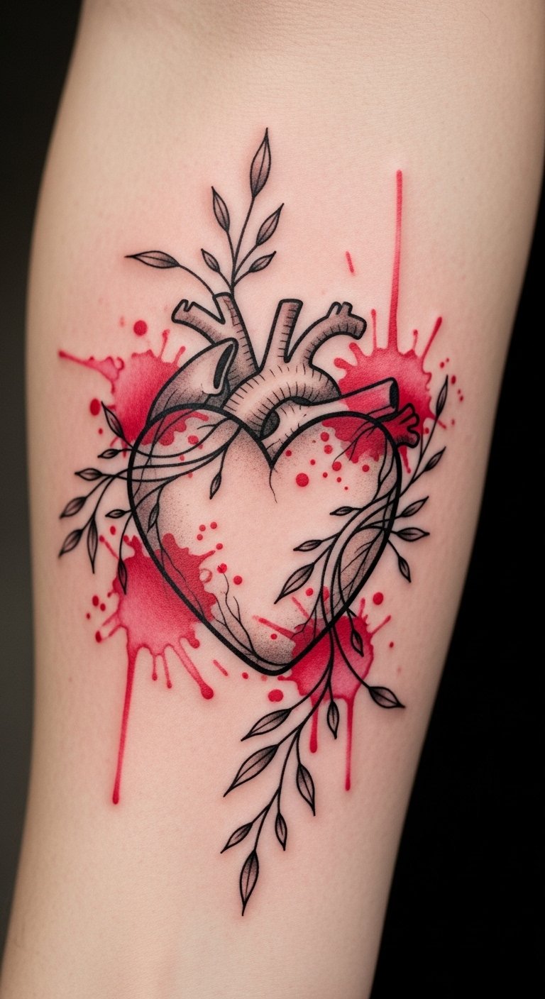 This heart tattoo symbolizes deep emotions of love and passion, blending vibrant colors and intricate details to tell a personal story.