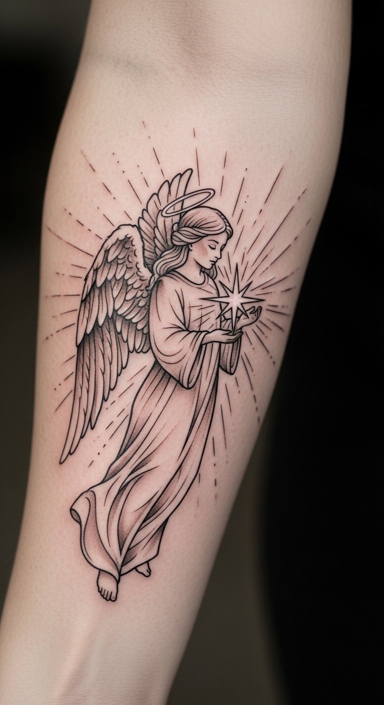 Placed on the forearm, it remains visible, serving as a constant reminder of inner strength and guidance. The angel symbolizes love and support, while the star reflects hope and aspiration, inviting the wearer to embrace their journey and shine brightly against life’s challenges.