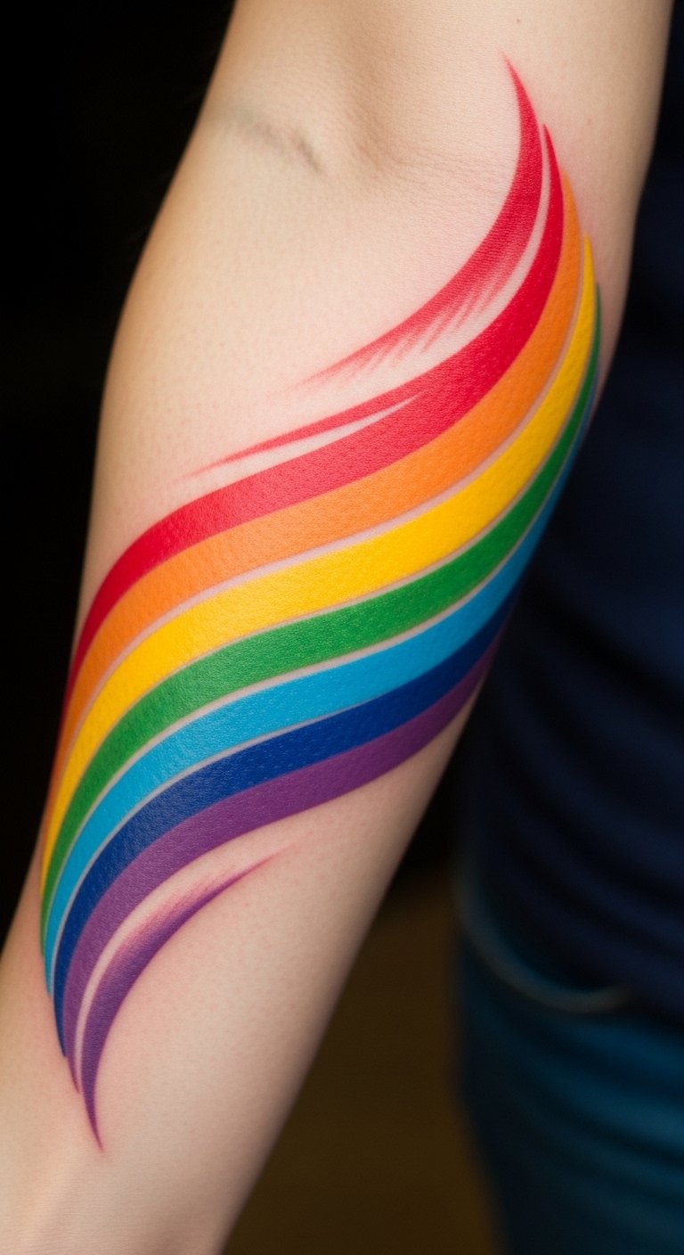 This rainbow tattoo symbolizes love, acceptance, and the beauty of diversity, representing a journey of personal growth and resilience.